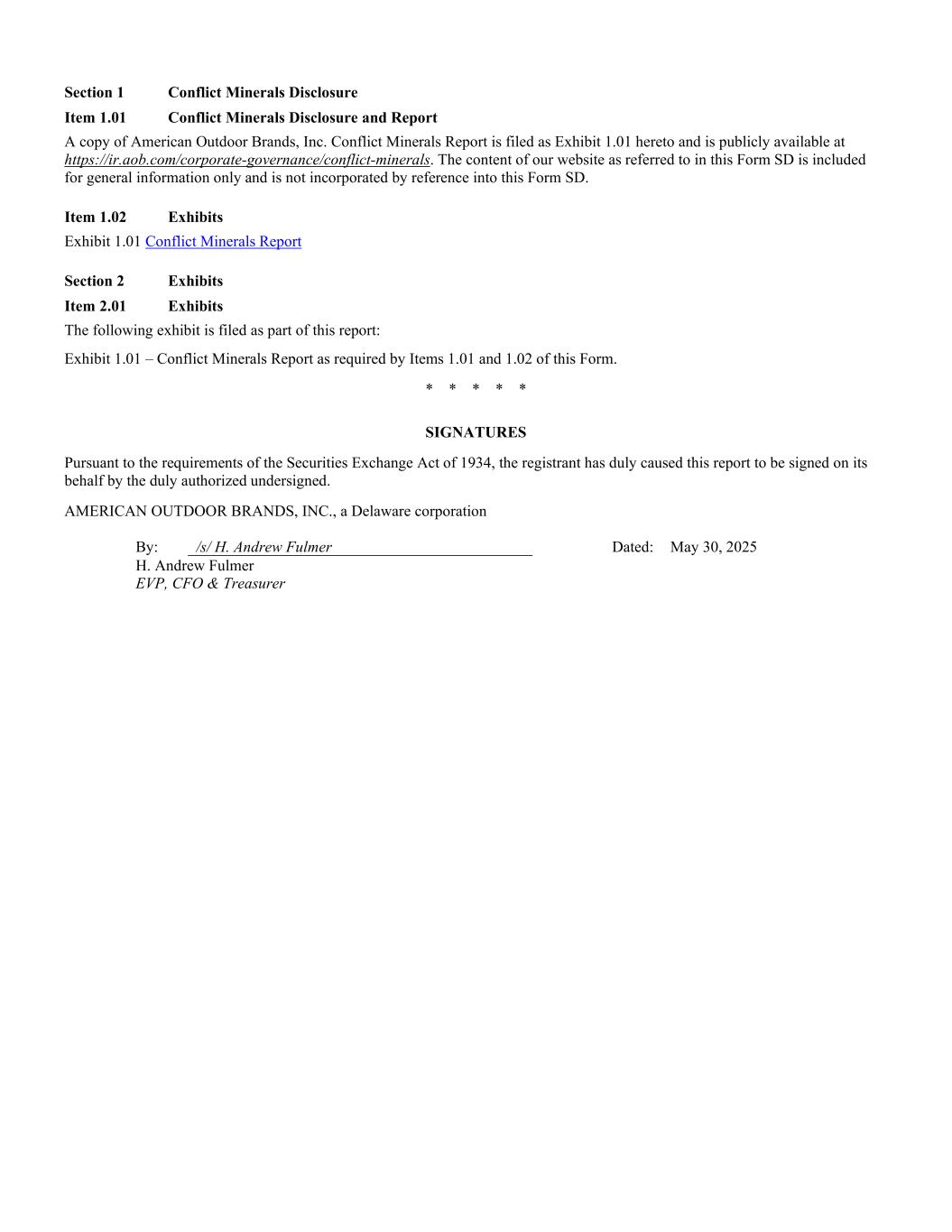 Section 1 Conflict Minerals Disclosure Item 1.01 Conflict Minerals Disclosure and Report A copy of American Outdoor Brands, Inc. Conflict Minerals Report is filed as Exhibit 1.01 hereto and is publicly available at https://ir.aob.com/corporate-governance/conflict-minerals. The content of our website as referred to in this Form SD is included for general information only and is not incorporated by reference into this Form SD. Item 1.02 Exhibits Exhibit 1.01 Conflict Minerals Report Section 2 Exhibits Item 2.01 Exhibits The following exhibit is filed as part of this report: Exhibit 1.01 – Conflict Minerals Report as required by Items 1.01 and 1.02 of this Form. * * * * * SIGNATURES Pursuant to the requirements of the Securities Exchange Act of 1934, the registrant has duly caused this report to be signed on its behalf by the duly authorized undersigned. AMERICAN OUTDOOR BRANDS, INC., a Delaware corporation By: /s/ H. Andrew Fulmer Dated: May 30, 2025 H. Andrew Fulmer EVP, CFO & Treasurer