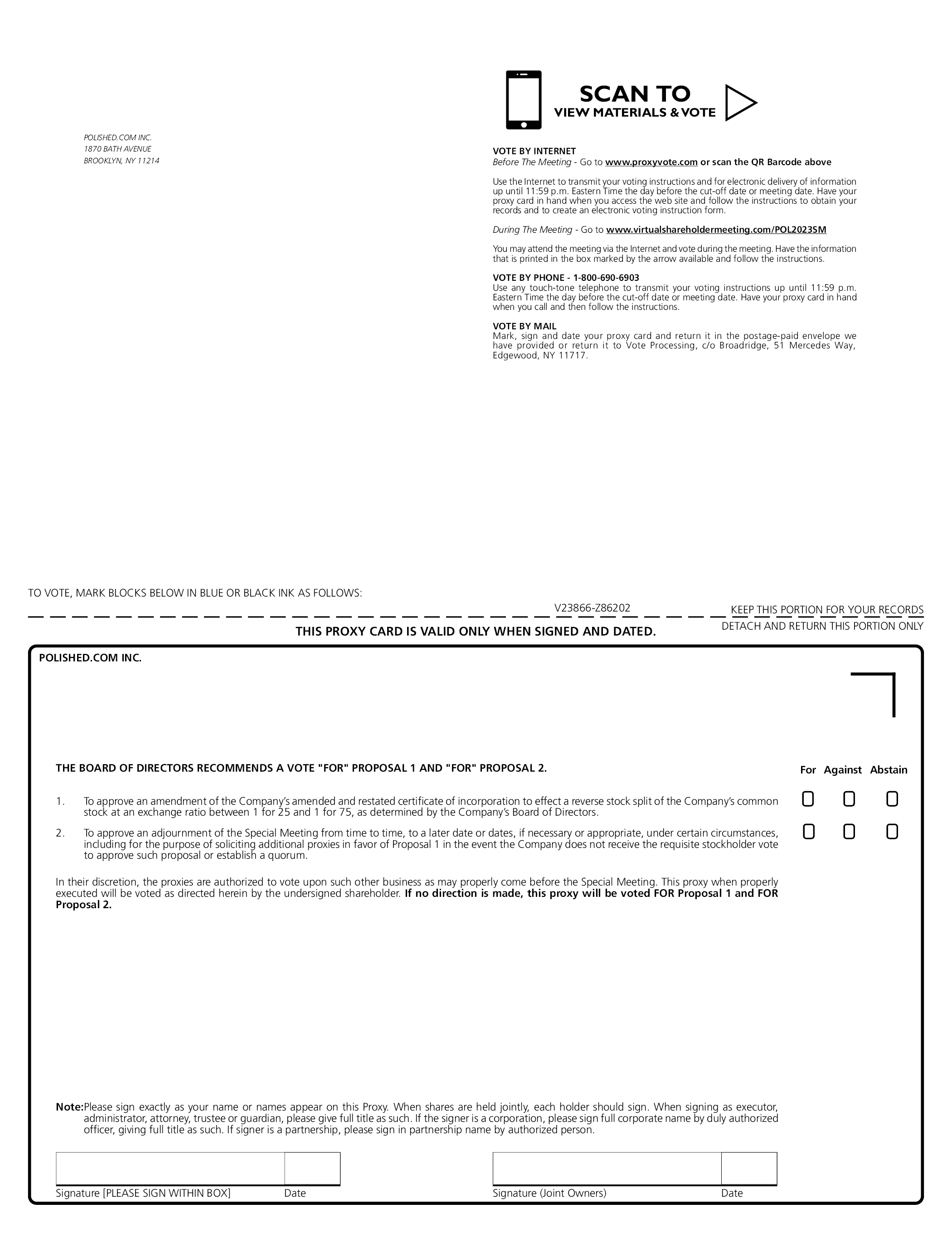POLISHED.COM INC. 1870 BATH AVENUE BROOKLYN, NY 11214 SCAN TO VIEW MATERIALS & VOTE VOTE BY INTERNET Before The Meeting - Go to www.proxyvote.com or scan the QR Barcode above Use the Internet to transmit your voting instructions and for electronic delivery of information up until 11:59 p.m. Eastern Time the day before the cut-off date or meeting date. Have your proxy card in hand when you access the web site and follow the instructions to obtain your records and to create an electronic voting instruction form. During The Meeting - Go to www.virtualshareholdermeeting.com/POL2023SM You may attend the meeting via the Internet and vote during the meeting. Have the information that is printed in the box marked by the arrow available and follow the instructions. VOTE BY PHONE - 1-800-690-6903 Use any touch-tone telephone to transmit your voting instructions up until 11:59 p.m. Eastern Time the day before the cut-off date or meeting date. Have your proxy card in hand when you call and then follow the instructions. VOTE BY MAIL Mark, sign and date your proxy card and return it in the postage-paid envelope we have provided or return it to Vote Processing, c/o Broadridge, 51 Mercedes Way, Edgewood, NY 11717. TO VOTE, MARK BLOCKS BELOW IN BLUE OR BLACK INK AS FOLLOWS: V23866-Z86202 KEEP THIS PORTION FOR YOUR RECORDS THIS PROXY CARD IS VALID ONLY WHEN SIGNED AND DATED. DETACH AND RETURN THIS PORTION ONLY POLISHED.COM INC. THE BOARD OF DIRECTORS RECOMMENDS A VOTE “FOR” PROPOSAL 1 AND “FOR” PROPOSAL 2. 1. To approve an amendment of the Company’s amended and restated certificate of incorporation to effect a reverse stock split of the Company’s common stock at an exchange ratio between 1 for 25 and 1 for 75, as determined by the Company’s Board of Directors. 2. To approve an adjournment of the Special Meeting from time to time, to a later date or dates, if necessary or appropriate, under certain circumstances, including for the purpose of soliciting additional proxies in favor of Proposal 1 in the event the Company does not receive the requisite stockholder vote to approve such proposal or establish a quorum. In their discretion, the proxies are authorized to vote upon such other business as may properly come before the Special Meeting. This proxy when properly executed will be voted as directed herein by the undersigned shareholder. If no direction is made, this proxy will be voted FOR Proposal 1 and FOR Proposal 2. Note: Please sign exactly as your name or names appear on this Proxy. When shares are held jointly, each holder should sign. When signing as executor, administrator, attorney, trustee or guardian, please give full title as such. If the signer is a corporation, please sign full corporate name by duly authorized officer, giving full title as such. If signer is a partnership, please sign in partnership name by authorized person. Signature [PLEASE SIGN WITHIN BOX] Date Signature (Joint Owners) Date For Against Abstain