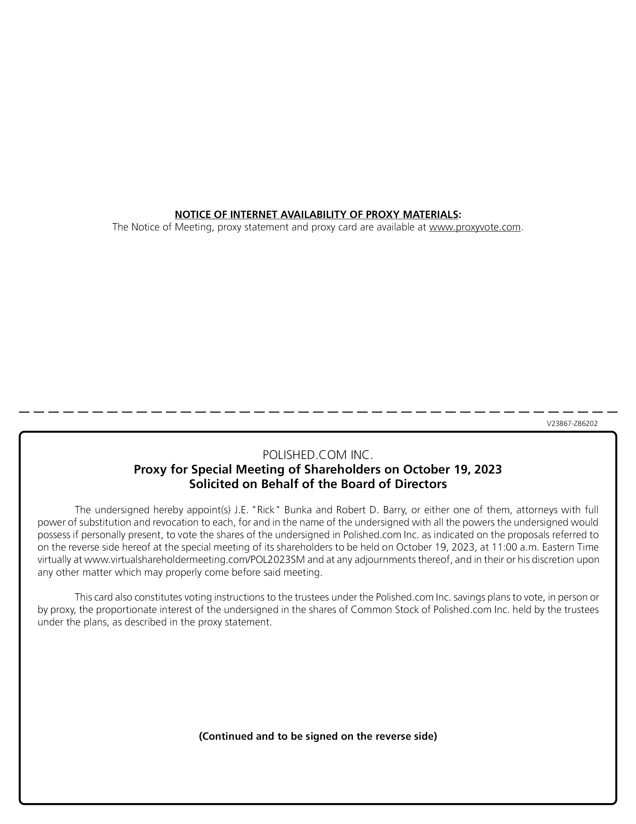 NOTICE OF INTERNET AVAILABILITY OF PROXY MATERIALS: The Notice of Meeting, proxy statement and proxy card are available at www.proxyvote.com. POLISHED.COM INC. Proxy for Special Meeting of Shareholders on October 19, 2023 Solicited on Behalf of the Board of Directors The undersigned hereby appoint(s) J.E. “Rick” Bunka and Robert D. Barry, or either one of them, attorneys with full power of substitution and revocation to each, for and in the name of the undersigned with all the powers the undersigned would possess if personally present, to vote the shares of the undersigned in Polished.com Inc. as indicated on the proposals referred to on the reverse side hereof at the special meeting of its shareholders to be held on October 19, 2023, at 11:00 a.m. Eastern Timevirtually at www.virtualshareholdermeeting.com/POL2023SM and at any adjournments thereof, and in their or his discretion upon any other matter which may properly come before said meeting. This card also constitutes voting instructions to the trustees under the Polished.com Inc. savings plans to vote, in person or by proxy, the proportionate interest of the undersigned in the shares of Common Stock of Polished.com Inc. held by the trustees under the plans, as described in the proxy statement. (Continued and to be signed on the reverse side) V23867-Z86202
