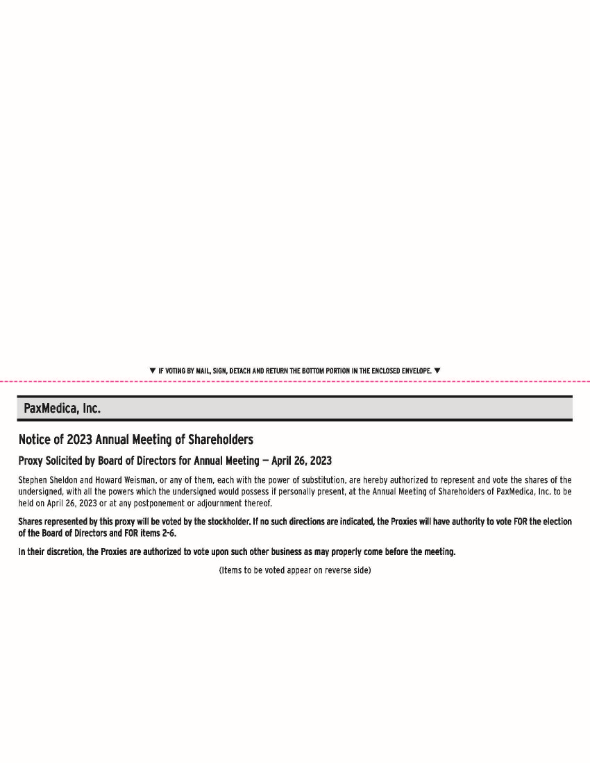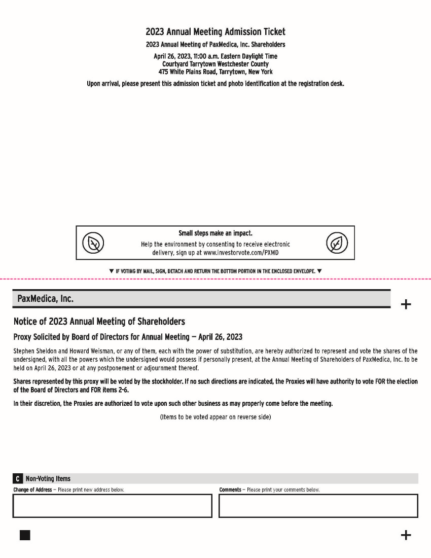 Notice of 2023 Annual Meeting of Shareholders Proxy Solicited by Board of Directors for Annual Meeting — April 26, 2023 Stephen Sheldon and Howard Weisman, or any of them, each with the power of substitution, are hereby authorized to represent and vote the shares of the undersigned, with all the powers which the undersigned would possess if personally present, at the Annual Meeting of Shareholders of PaxMedica, Inc . to be held on April 26 , 2023 or at any postponement or adjournment thereof . Shares represented by this proxy will be voted by the stockholder . If no such directions are indicated, the Proxies will have authority to vote FOR the election of the Board of Directors and FOR items 2 - 6 . In their discretion, the Proxies are authorized to vote upon such other business as may properly come before the meeting . (Items to be voted appear on reverse side) PaxMedica, Inc. q IF VOTING BY MAIL, SIGN, DETACH AND RETURN THE BOTTOM PORTION IN THE ENCLOSED ENVELOPE. q Change of Address — Please print new address below. Comments — Please print your comments below. Non - Voting Items C + + Small steps make an impact. Help the environment by consenting to receive electronic delivery, sign up at www.investorvote.com/PXMD 2023 Annual Meeting Admission Ticket 2023 Annual Meeting of PaxMedica, Inc. Shareholders April 26, 2023, 11:00 a.m. Eastern Daylight Time Courtyard Tarrytown Westchester County 475 White Plains Road, Tarrytown, New York Upon arrival, please present this admission ticket and photo identification at the registration desk.