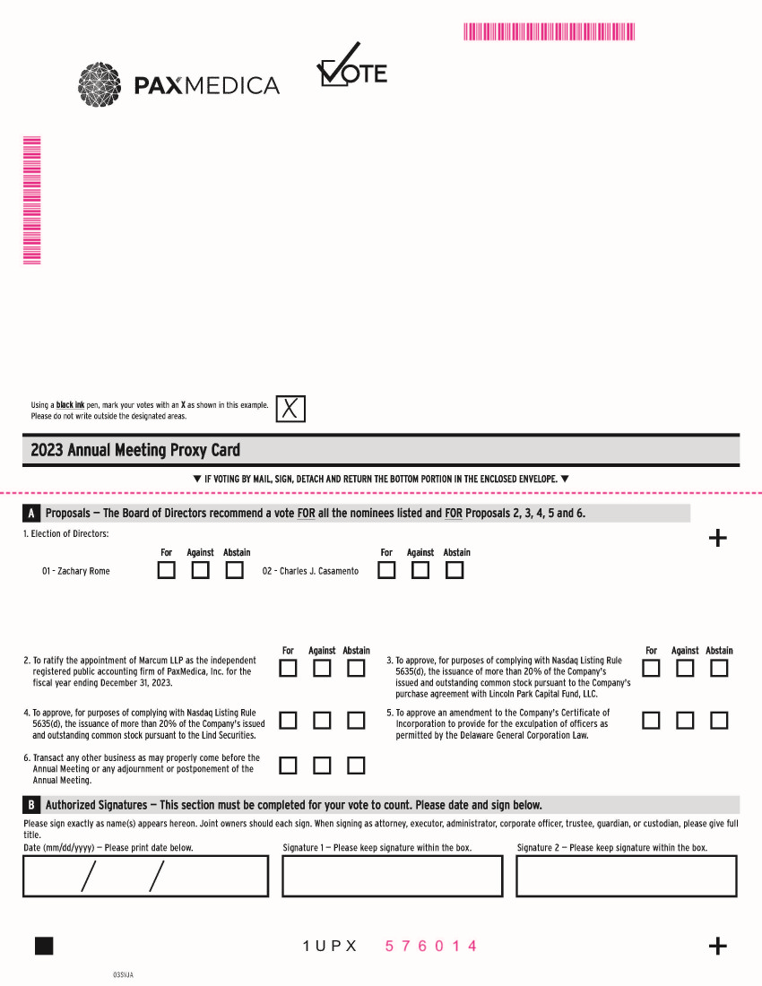 01 - Zachary Rome 02 - Charles J. Casamento For Against Abstain For Against Abstain 1 U P X Using a black ink pen, mark your votes with an X as shown in this example. Please do not write outside the designated areas. 0 3 S V I A + + Proposals — The Board of Directors recommend a vote FOR all the nominees listed and FOR Proposals 2, 3, 4, 5 and 6. A 2. To ratify the appointment of Marcum LLP as the independent registered public accounting firm of PaxMedica, Inc. for the fiscal year ending December 31, 2023. 3. To approve, for purposes of complying with Nasdaq Listing Rule 5635(d), the issuance of more than 20% of the Company's issued and outstanding common stock pursuant to the Company's purchase agreement with Lincoln Park Capital Fund, LLC. 5 . To approve an amendment to the Company's Certificate of Incorporation to provide for the exculpation of officers as permitted by the Delaware General Corporation Law . 1. Election of Directors: For Against Abstain Please sign exactly as name(s) appears hereon. Joint owners should each sign. When signing as attorney, executor, administrator, corporate officer, trustee, guardian, or custodian, please give full title. Date (mm/dd/yyyy) — Please print date below. Signature 1 — Please keep signature within the box. Signature 2 — Please keep signature within the box. Authorized Signatures — This section must be completed for your vote to count. Please date and sign below. B 4. To approve, for purposes of complying with Nasdaq Listing Rule 5635(d), the issuance of more than 20% of the Company's issued and outstanding common stock pursuant to the Lind Securities. 6. Transact any other business as may properly come before the Annual Meeting or any adjournment or postponement of the Annual Meeting. q IF VOTING BY MAIL, SIGN, DETACH AND RETURN THE BOTTOM PORTION IN THE ENCLOSED ENVELOPE. q 2023 Annual Meeting Proxy Card 1234 5678 9012 345 For Against Abstain 000004 ENDORSEMENT_LINE______________ SACKPACK_____________ MR A SAMPLE DESIGNATION (IF ANY) ADD 1 ADD 2 ADD 3 ADD 4 ADD 5 ADD 6 MMM MMM MMM 5 7 6 0 1 4 MR A SAMPLE (THIS AREA IS SET UP TO ACCOMMODATE 140 CHARACTERS) MR A SAMPLE AND MR A SAMPLE AND MR A SAMPLE AND MR A SAMPLE AND MR A SAMPLE AND MR A SAMPLE AND MR A SAMPLE AND MR A SAMPLE AND C 1234567890 J N T C123456789 000000000.000000 ext 000000000.000000 ext 000000000.000000 ext MMMMMMMMMMMM 000000000.000000 ext 000000000.000000 ext 000000000.000000 ext If no electronic voting, delete QR code and control # ∆ ≈ Online Go to www.investorvote.com/PXMD or scan the QR code — login details are located in the shaded bar below. Phone Call toll free 1 - 800 - 652 - VOTE (8683) within the USA, US territories and Canada Save paper, time and money! Sign up for electronic delivery at www.investorvote.com/PXMD Your vote matters – here’s how to vote! You may vote online or by phone instead of mailing this card. Votes submitted electronically must be received by 11:59 pm, Eastern Daylight Time, on April 25, 2023.