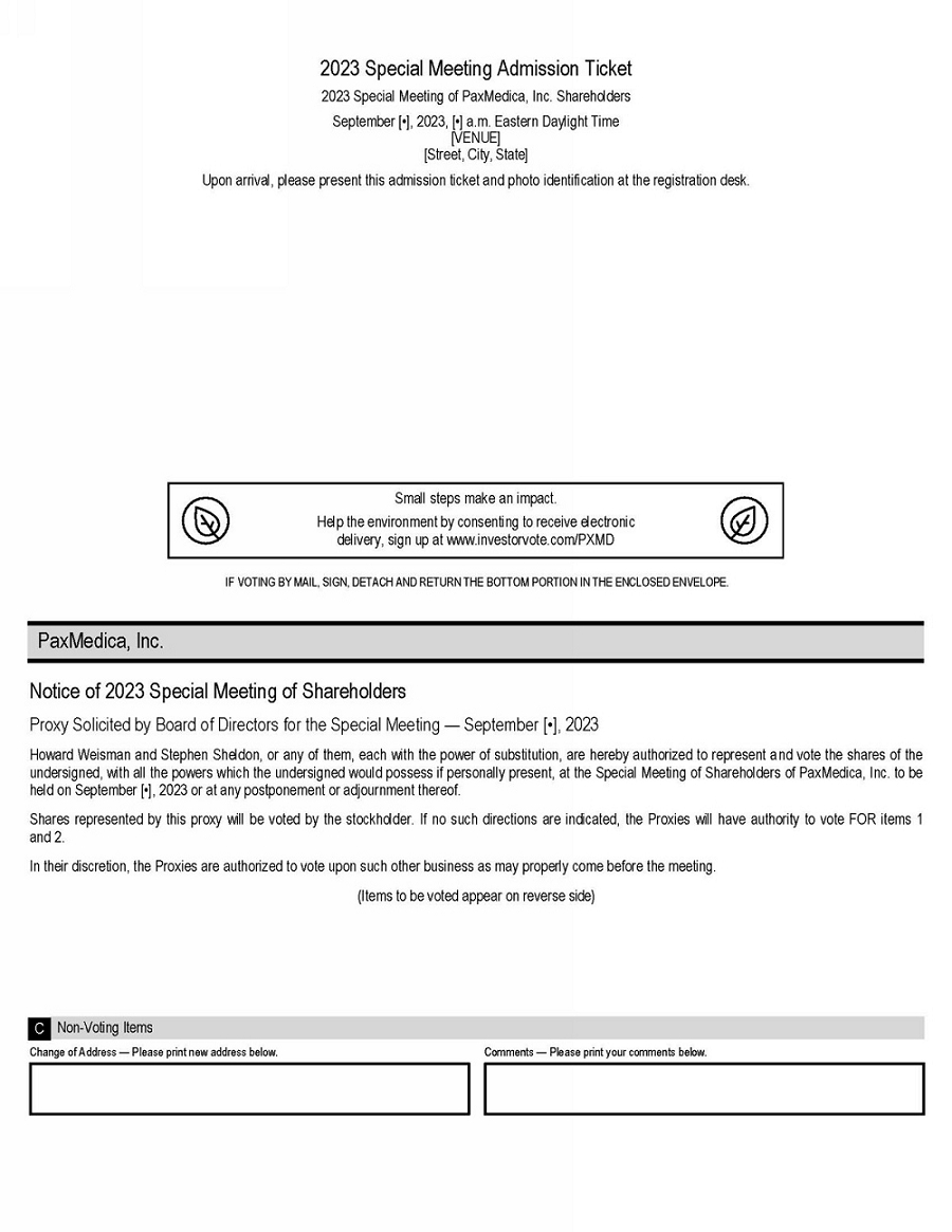 2023 Special Meeting Admission Ticket 2023 Special Meeting of PaxMedica, Inc. Shareholders September [•], 2023, [•] a.m. Eastern Daylight Time [VENUE] [Street, City, State] Upon arrival, please present this admission ticket and photo identification at the registration desk. IF VOTING BY MAIL, SIGN, DETACH AND RETURN THE BOTTOM PORTION IN THE ENCLOSED ENVELOPE. Change of Address — Please print new address below. Comments — Please print your comments below. Small steps make an impact. Help the environment by consenting to receive electronic delivery, sign up at www.investorvote.com/PXMD PaxMedica, Inc. Notice of 2023 Special Meeting of Shareholders Proxy Solicited by Board of Directors for the Special Meeting — September [•], 2023 Howard Weisman and Stephen Sheldon, or any of them, each with the power of substitution, are hereby authorized to represent and vote the shares of the undersigned, with all the powers which the undersigned would possess if personally present, at the Special Meeting of Shareholders of PaxMedica, Inc . to be held on September [ • ], 2023 or at any postponement or adjournment thereof . Shares represented by this proxy will be voted by the stockholder . If no such directions are indicated, the Proxies will have authority to vote FOR items 1 and 2 . In their discretion, the Proxies are authorized to vote upon such other business as may properly come before the meeting . (Items to be voted appear on reverse side) Non - Voting Items C