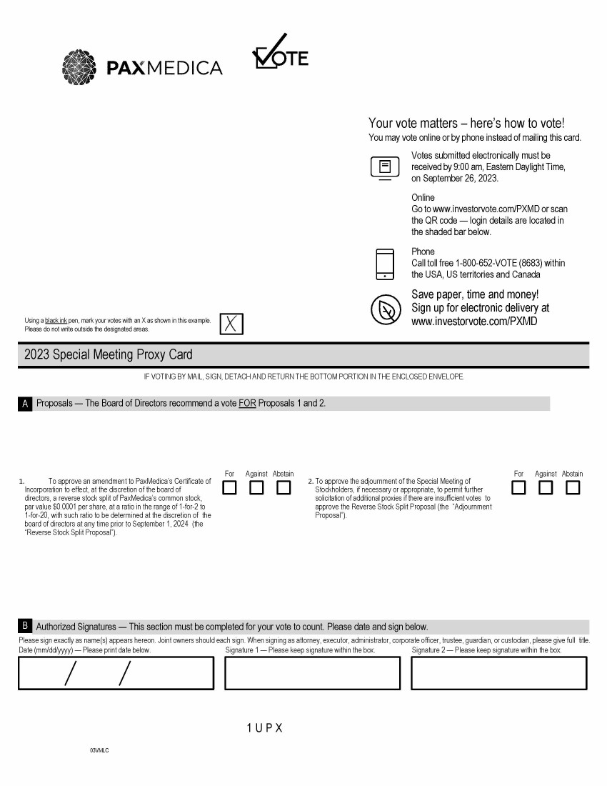 Using a black ink pen, mark your votes with an X as shown in this example. Please do not write outside the designated areas. Your vote matters – here’s how to vote! You may vote online or by phone instead of mailing this card. Votes submitted electronically must be received by 9:00 am, Eastern Daylight Time, on September 26, 2023. Online Go to www.investorvote.com/PXMD or scan the QR code — login details are located in the shaded bar below. Phone Call toll free 1 - 800 - 652 - VOTE (8683) within the USA, US territories and Canada Save paper, time and money! Sign up for electronic delivery at www.investorvote.com/PXMD IF VOTING BY MAIL, SIGN, DETACH AND RETURN THE BOTTOM PORTION IN THE ENCLOSED ENVELOPE. 1. To approve an amendment to PaxMedica’s Certificate of Incorporation to effect, at the discretion of the board of directors, a reverse stock split of PaxMedica’s common stock, par value $0.0001 per share, at a ratio in the range of 1 - for - 2 to 1 - for - 20, with such ratio to be determined at the discretion of the board of directors at any time prior to September 1, 2024 (the “Reverse Stock Split Proposal”). For Against Abstain 2. To approve the adjournment of the Special Meeting of Stockholders, if necessary or appropriate, to permit further solicitation of additional proxies if there are insufficient votes to approve the Reverse Stock Split Proposal (the “Adjournment Proposal”). For Against Abstain Please sign exactly as name(s) appears hereon. Joint owners should each sign. When signing as attorney, executor, administrat or, corporate officer, trustee, guardian, or custodian, please give full title. Date (mm/dd/yyyy) — Please print date below. Signature 1 — Please keep signature within the box. Signature 2 — Please keep signature within the box. 1 U P X 03 VM L C Authorized Signatures — This section must be completed for your vote to count. Please date and sign below. 2023 Special Meeting Proxy Card Proposals — The Board of Directors recommend a vote FOR Proposals 1 and 2. A B