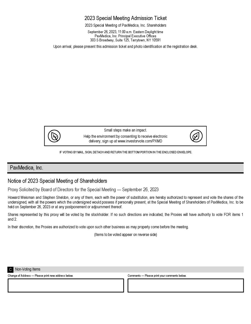 2023 Special Meeting Admission Ticket 2023 Special Meeting of PaxMedica, Inc. Shareholders September 26, 2023, 11:00 a.m. Eastern Daylight time PaxMedica, Inc. Principal Executive Offices 303 S Broadway, Suite 125, Tarrytown, NY 10591 Upon arrival, please present this admission ticket and photo identification at the registration desk. IF VOTING BY MAIL, SIGN, DETACH AND RETURN THE BOTTOM PORTION IN THE ENCLOSED ENVELOPE. Change of Address — Please print new address below. Comments — Please print your comments below. Small steps make an impact. Help the environment by consenting to receive electronic delivery, sign up at www.investorvote.com/PXMD PaxMedica, Inc . Notice of 2023 Special Meeting of Shareholders Proxy Solicited by Board of Directors for the Special Meeting — September 26 , 2023 Howard Weisman and Stephen Sheldon, or any of them, each with the power of substitution, are hereby authorized to represent and vote the shares of the undersigned, with all the powers which the undersigned would possess if personally present, at the Special Meeting of Shareholders of PaxMedica, Inc . to be held on September 26 , 2023 or at any postponement or adjournment thereof . Shares represented by this proxy will be voted by the stockholder . If no such directions are indicated, the Proxies will have authority to vote FOR items 1 and 2 . In their discretion, the Proxies are authorized to vote upon such other business as may properly come before the meeting . (Items to be voted appear on reverse side) Non - Voting Items C