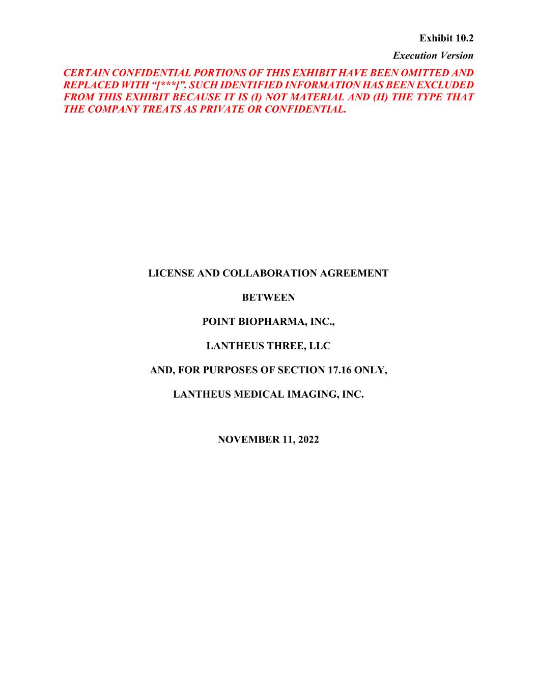 Exhibit 10.2 Execution Version CERTAIN CONFIDENTIAL PORTIONS OF THIS EXHIBIT HAVE BEEN OMITTED AND REPLACED WITH “[***]”. SUCH IDENTIFIED INFORMATION HAS BEEN EXCLUDED FROM THIS EXHIBIT BECAUSE IT IS (I) NOT MATERIAL AND (II) THE TYPE THAT THE COMPANY TREATS AS PRIVATE OR CONFIDENTIAL. LICENSE AND COLLABORATION AGREEMENT BETWEEN POINT BIOPHARMA, INC., LANTHEUS THREE, LLC AND, FOR PURPOSES OF SECTION 17.16 ONLY, LANTHEUS MEDICAL IMAGING, INC. NOVEMBER 11, 2022