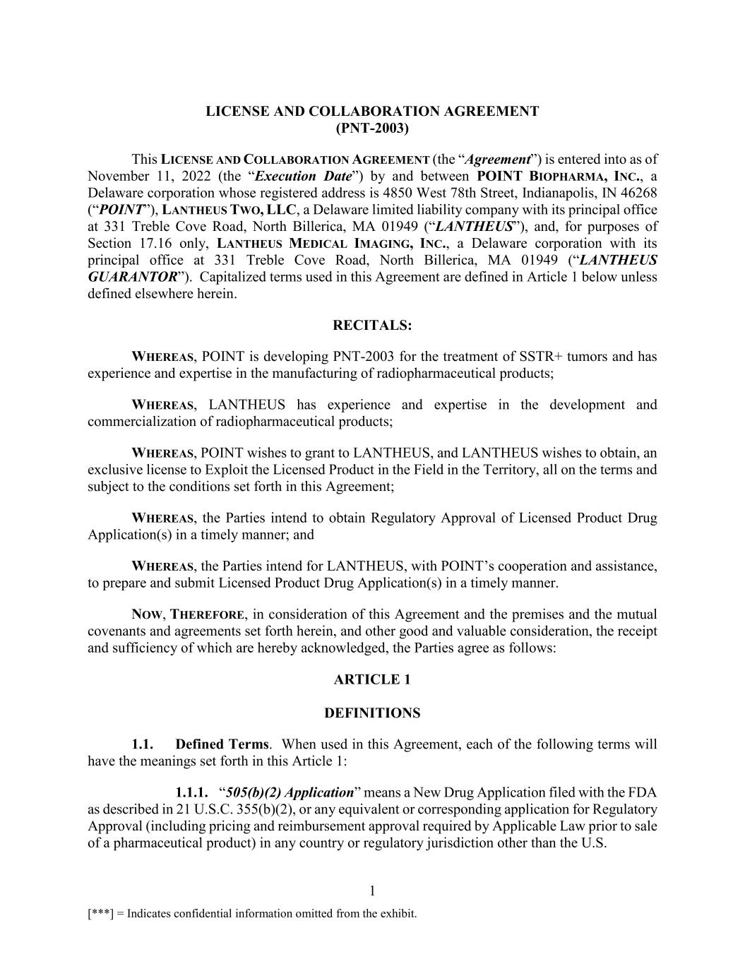 1 [***] = Indicates confidential information omitted from the exhibit. LICENSE AND COLLABORATION AGREEMENT (PNT-2003) This LICENSE AND COLLABORATION AGREEMENT (the “Agreement”) is entered into as of November 11, 2022 (the “Execution Date”) by and between POINT BIOPHARMA, INC., a Delaware corporation whose registered address is 4850 West 78th Street, Indianapolis, IN 46268 (“POINT”), LANTHEUS TWO, LLC, a Delaware limited liability company with its principal office at 331 Treble Cove Road, North Billerica, MA 01949 (“LANTHEUS”), and, for purposes of Section 17.16 only, LANTHEUS MEDICAL IMAGING, INC., a Delaware corporation with its principal office at 331 Treble Cove Road, North Billerica, MA 01949 (“LANTHEUS GUARANTOR”). Capitalized terms used in this Agreement are defined in Article 1 below unless defined elsewhere herein. RECITALS: WHEREAS, POINT is developing PNT-2003 for the treatment of SSTR+ tumors and has experience and expertise in the manufacturing of radiopharmaceutical products; WHEREAS, LANTHEUS has experience and expertise in the development and commercialization of radiopharmaceutical products; WHEREAS, POINT wishes to grant to LANTHEUS, and LANTHEUS wishes to obtain, an exclusive license to Exploit the Licensed Product in the Field in the Territory, all on the terms and subject to the conditions set forth in this Agreement; WHEREAS, the Parties intend to obtain Regulatory Approval of Licensed Product Drug Application(s) in a timely manner; and WHEREAS, the Parties intend for LANTHEUS, with POINT’s cooperation and assistance, to prepare and submit Licensed Product Drug Application(s) in a timely manner. NOW, THEREFORE, in consideration of this Agreement and the premises and the mutual covenants and agreements set forth herein, and other good and valuable consideration, the receipt and sufficiency of which are hereby acknowledged, the Parties agree as follows: ARTICLE 1 DEFINITIONS 1.1. Defined Terms. When used in this Agreement, each of the following terms will have the meanings set forth in this Article 1: 1.1.1. “505(b)(2) Application” means a New Drug Application filed with the FDA as described in 21 U.S.C. 355(b)(2), or any equivalent or corresponding application for Regulatory Approval (including pricing and reimbursement approval required by Applicable Law prior to sale of a pharmaceutical product) in any country or regulatory jurisdiction other than the U.S.