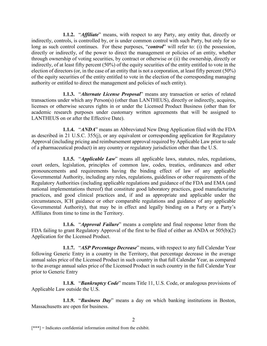 2 [***] = Indicates confidential information omitted from the exhibit. 1.1.2. “Affiliate” means, with respect to any Party, any entity that, directly or indirectly, controls, is controlled by, or is under common control with such Party, but only for so long as such control continues. For these purposes, “control” will refer to: (i) the possession, directly or indirectly, of the power to direct the management or policies of an entity, whether through ownership of voting securities, by contract or otherwise or (ii) the ownership, directly or indirectly, of at least fifty percent (50%) of the equity securities of the entity entitled to vote in the election of directors (or, in the case of an entity that is not a corporation, at least fifty percent (50%) of the equity securities of the entity entitled to vote in the election of the corresponding managing authority or entitled to direct the management and policies of such entity). 1.1.3. “Alternate License Proposal” means any transaction or series of related transactions under which any Person(s) (other than LANTHEUS), directly or indirectly, acquires, licenses or otherwise secures rights in or under the Licensed Product Business (other than for academic research purposes under customary written agreements that will be assigned to LANTHEUS on or after the Effective Date). 1.1.4. “ANDA” means an Abbreviated New Drug Application filed with the FDA as described in 21 U.S.C. 355(j), or any equivalent or corresponding application for Regulatory Approval (including pricing and reimbursement approval required by Applicable Law prior to sale of a pharmaceutical product) in any country or regulatory jurisdiction other than the U.S. 1.1.5. “Applicable Law” means all applicable laws, statutes, rules, regulations, court orders, legislation, principles of common law, codes, treaties, ordinances and other pronouncements and requirements having the binding effect of law of any applicable Governmental Authority, including any rules, regulations, guidelines or other requirements of the Regulatory Authorities (including applicable regulations and guidance of the FDA and EMA (and national implementations thereof) that constitute good laboratory practices, good manufacturing practices, and good clinical practices and, if and as appropriate and applicable under the circumstances, ICH guidance or other comparable regulations and guidance of any applicable Governmental Authority), that may be in effect and legally binding on a Party or a Party’s Affiliates from time to time in the Territory. 1.1.6. “Approval Failure” means a complete and final response letter from the FDA failing to grant Regulatory Approval of the first to be filed of either an ANDA or 505(b)(2) Application for the Licensed Product. 1.1.7. “ASP Percentage Decrease” means, with respect to any full Calendar Year following Generic Entry in a country in the Territory, that percentage decrease in the average annual sales price of the Licensed Product in such country in that full Calendar Year, as compared to the average annual sales price of the Licensed Product in such country in the full Calendar Year prior to Generic Entry 1.1.8. “Bankruptcy Code” means Title 11, U.S. Code, or analogous provisions of Applicable Law outside the U.S. 1.1.9. “Business Day” means a day on which banking institutions in Boston, Massachusetts are open for business.