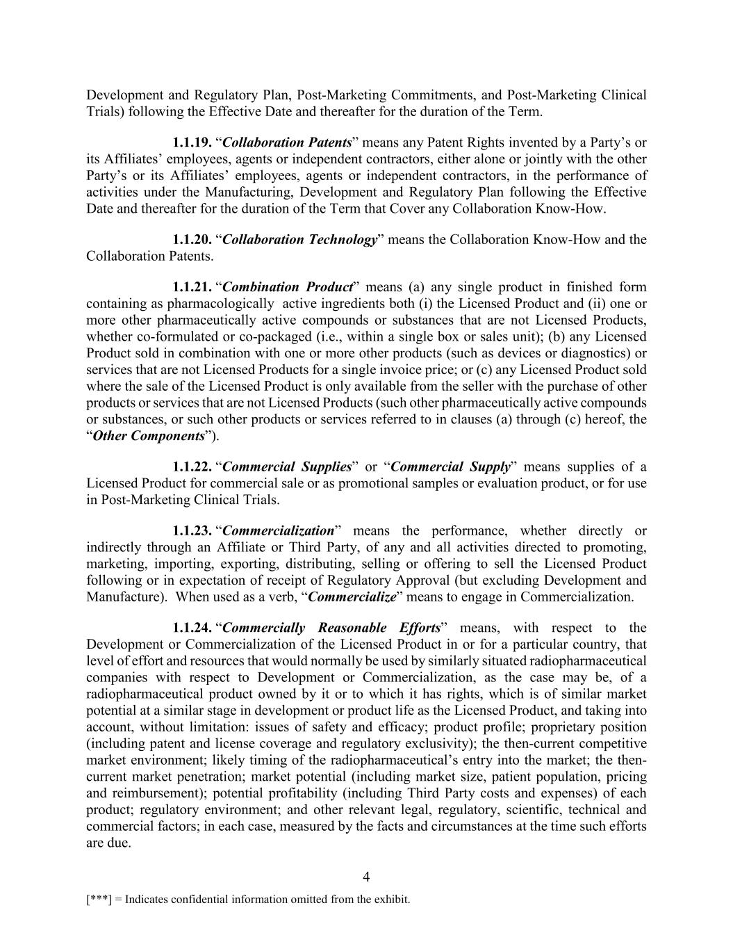 4 [***] = Indicates confidential information omitted from the exhibit. Development and Regulatory Plan, Post-Marketing Commitments, and Post-Marketing Clinical Trials) following the Effective Date and thereafter for the duration of the Term. 1.1.19. “Collaboration Patents” means any Patent Rights invented by a Party’s or its Affiliates’ employees, agents or independent contractors, either alone or jointly with the other Party’s or its Affiliates’ employees, agents or independent contractors, in the performance of activities under the Manufacturing, Development and Regulatory Plan following the Effective Date and thereafter for the duration of the Term that Cover any Collaboration Know-How. 1.1.20. “Collaboration Technology” means the Collaboration Know-How and the Collaboration Patents. 1.1.21. “Combination Product” means (a) any single product in finished form containing as pharmacologically active ingredients both (i) the Licensed Product and (ii) one or more other pharmaceutically active compounds or substances that are not Licensed Products, whether co-formulated or co-packaged (i.e., within a single box or sales unit); (b) any Licensed Product sold in combination with one or more other products (such as devices or diagnostics) or services that are not Licensed Products for a single invoice price; or (c) any Licensed Product sold where the sale of the Licensed Product is only available from the seller with the purchase of other products or services that are not Licensed Products (such other pharmaceutically active compounds or substances, or such other products or services referred to in clauses (a) through (c) hereof, the “Other Components”). 1.1.22. “Commercial Supplies” or “Commercial Supply” means supplies of a Licensed Product for commercial sale or as promotional samples or evaluation product, or for use in Post-Marketing Clinical Trials. 1.1.23. “Commercialization” means the performance, whether directly or indirectly through an Affiliate or Third Party, of any and all activities directed to promoting, marketing, importing, exporting, distributing, selling or offering to sell the Licensed Product following or in expectation of receipt of Regulatory Approval (but excluding Development and Manufacture). When used as a verb, “Commercialize” means to engage in Commercialization. 1.1.24. “Commercially Reasonable Efforts” means, with respect to the Development or Commercialization of the Licensed Product in or for a particular country, that level of effort and resources that would normally be used by similarly situated radiopharmaceutical companies with respect to Development or Commercialization, as the case may be, of a radiopharmaceutical product owned by it or to which it has rights, which is of similar market potential at a similar stage in development or product life as the Licensed Product, and taking into account, without limitation: issues of safety and efficacy; product profile; proprietary position (including patent and license coverage and regulatory exclusivity); the then-current competitive market environment; likely timing of the radiopharmaceutical’s entry into the market; the then- current market penetration; market potential (including market size, patient population, pricing and reimbursement); potential profitability (including Third Party costs and expenses) of each product; regulatory environment; and other relevant legal, regulatory, scientific, technical and commercial factors; in each case, measured by the facts and circumstances at the time such efforts are due.