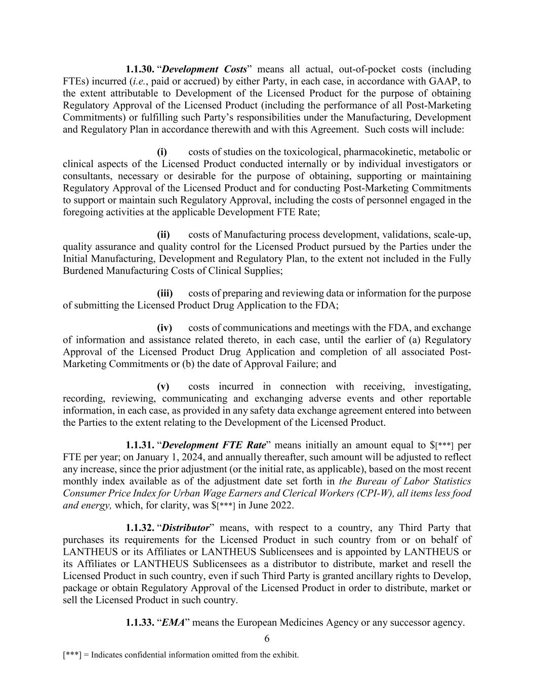 6 [***] = Indicates confidential information omitted from the exhibit. 1.1.30. “Development Costs” means all actual, out-of-pocket costs (including FTEs) incurred (i.e., paid or accrued) by either Party, in each case, in accordance with GAAP, to the extent attributable to Development of the Licensed Product for the purpose of obtaining Regulatory Approval of the Licensed Product (including the performance of all Post-Marketing Commitments) or fulfilling such Party’s responsibilities under the Manufacturing, Development and Regulatory Plan in accordance therewith and with this Agreement. Such costs will include: (i) costs of studies on the toxicological, pharmacokinetic, metabolic or clinical aspects of the Licensed Product conducted internally or by individual investigators or consultants, necessary or desirable for the purpose of obtaining, supporting or maintaining Regulatory Approval of the Licensed Product and for conducting Post-Marketing Commitments to support or maintain such Regulatory Approval, including the costs of personnel engaged in the foregoing activities at the applicable Development FTE Rate; (ii) costs of Manufacturing process development, validations, scale-up, quality assurance and quality control for the Licensed Product pursued by the Parties under the Initial Manufacturing, Development and Regulatory Plan, to the extent not included in the Fully Burdened Manufacturing Costs of Clinical Supplies; (iii) costs of preparing and reviewing data or information for the purpose of submitting the Licensed Product Drug Application to the FDA; (iv) costs of communications and meetings with the FDA, and exchange of information and assistance related thereto, in each case, until the earlier of (a) Regulatory Approval of the Licensed Product Drug Application and completion of all associated Post- Marketing Commitments or (b) the date of Approval Failure; and (v) costs incurred in connection with receiving, investigating, recording, reviewing, communicating and exchanging adverse events and other reportable information, in each case, as provided in any safety data exchange agreement entered into between the Parties to the extent relating to the Development of the Licensed Product. 1.1.31. “Development FTE Rate” means initially an amount equal to $[***] per FTE per year; on January 1, 2024, and annually thereafter, such amount will be adjusted to reflect any increase, since the prior adjustment (or the initial rate, as applicable), based on the most recent monthly index available as of the adjustment date set forth in the Bureau of Labor Statistics Consumer Price Index for Urban Wage Earners and Clerical Workers (CPI-W), all items less food and energy, which, for clarity, was $[***] in June 2022. 1.1.32. “Distributor” means, with respect to a country, any Third Party that purchases its requirements for the Licensed Product in such country from or on behalf of LANTHEUS or its Affiliates or LANTHEUS Sublicensees and is appointed by LANTHEUS or its Affiliates or LANTHEUS Sublicensees as a distributor to distribute, market and resell the Licensed Product in such country, even if such Third Party is granted ancillary rights to Develop, package or obtain Regulatory Approval of the Licensed Product in order to distribute, market or sell the Licensed Product in such country. 1.1.33. “EMA” means the European Medicines Agency or any successor agency.