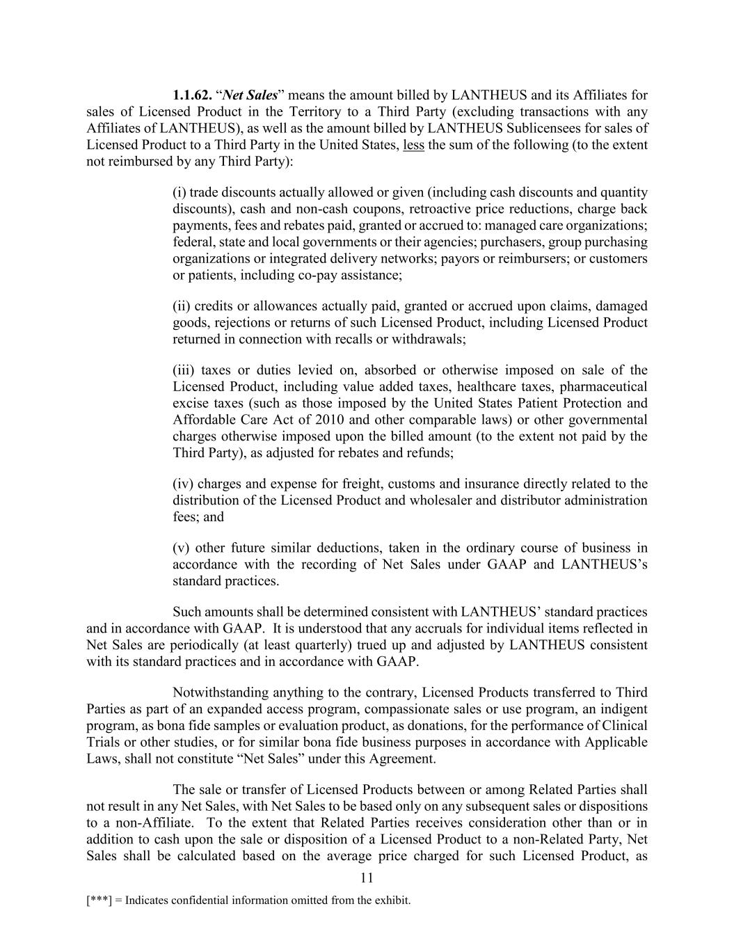 11 [***] = Indicates confidential information omitted from the exhibit. 1.1.62. “Net Sales” means the amount billed by LANTHEUS and its Affiliates for sales of Licensed Product in the Territory to a Third Party (excluding transactions with any Affiliates of LANTHEUS), as well as the amount billed by LANTHEUS Sublicensees for sales of Licensed Product to a Third Party in the United States, less the sum of the following (to the extent not reimbursed by any Third Party): (i) trade discounts actually allowed or given (including cash discounts and quantity discounts), cash and non-cash coupons, retroactive price reductions, charge back payments, fees and rebates paid, granted or accrued to: managed care organizations; federal, state and local governments or their agencies; purchasers, group purchasing organizations or integrated delivery networks; payors or reimbursers; or customers or patients, including co-pay assistance; (ii) credits or allowances actually paid, granted or accrued upon claims, damaged goods, rejections or returns of such Licensed Product, including Licensed Product returned in connection with recalls or withdrawals; (iii) taxes or duties levied on, absorbed or otherwise imposed on sale of the Licensed Product, including value added taxes, healthcare taxes, pharmaceutical excise taxes (such as those imposed by the United States Patient Protection and Affordable Care Act of 2010 and other comparable laws) or other governmental charges otherwise imposed upon the billed amount (to the extent not paid by the Third Party), as adjusted for rebates and refunds; (iv) charges and expense for freight, customs and insurance directly related to the distribution of the Licensed Product and wholesaler and distributor administration fees; and (v) other future similar deductions, taken in the ordinary course of business in accordance with the recording of Net Sales under GAAP and LANTHEUS’s standard practices. Such amounts shall be determined consistent with LANTHEUS’ standard practices and in accordance with GAAP. It is understood that any accruals for individual items reflected in Net Sales are periodically (at least quarterly) trued up and adjusted by LANTHEUS consistent with its standard practices and in accordance with GAAP. Notwithstanding anything to the contrary, Licensed Products transferred to Third Parties as part of an expanded access program, compassionate sales or use program, an indigent program, as bona fide samples or evaluation product, as donations, for the performance of Clinical Trials or other studies, or for similar bona fide business purposes in accordance with Applicable Laws, shall not constitute “Net Sales” under this Agreement. The sale or transfer of Licensed Products between or among Related Parties shall not result in any Net Sales, with Net Sales to be based only on any subsequent sales or dispositions to a non-Affiliate. To the extent that Related Parties receives consideration other than or in addition to cash upon the sale or disposition of a Licensed Product to a non-Related Party, Net Sales shall be calculated based on the average price charged for such Licensed Product, as