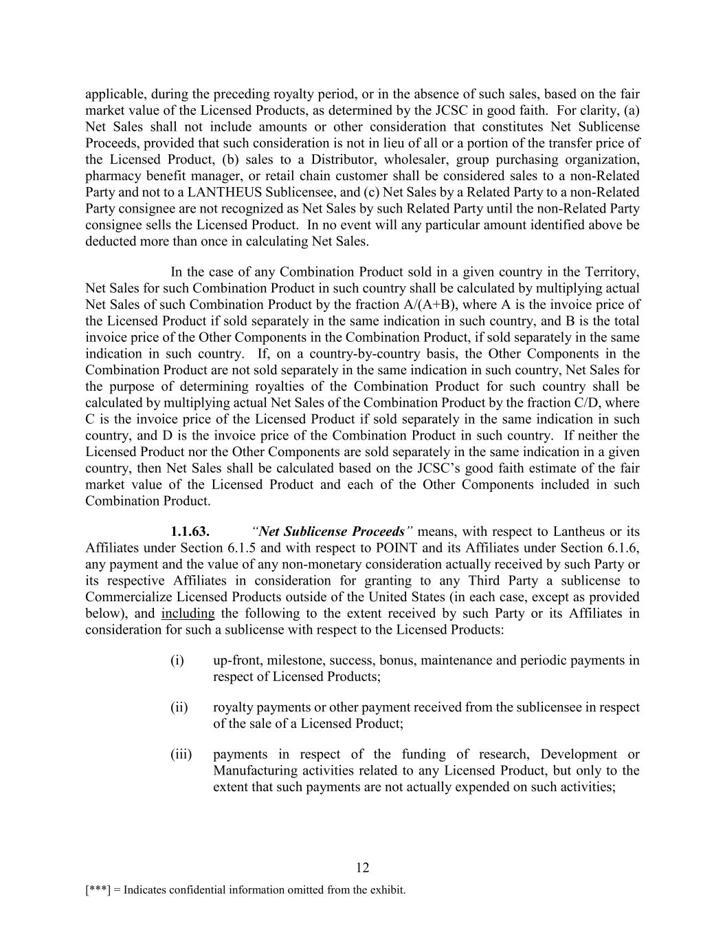 12 [***] = Indicates confidential information omitted from the exhibit. applicable, during the preceding royalty period, or in the absence of such sales, based on the fair market value of the Licensed Products, as determined by the JCSC in good faith. For clarity, (a) Net Sales shall not include amounts or other consideration that constitutes Net Sublicense Proceeds, provided that such consideration is not in lieu of all or a portion of the transfer price of the Licensed Product, (b) sales to a Distributor, wholesaler, group purchasing organization, pharmacy benefit manager, or retail chain customer shall be considered sales to a non-Related Party and not to a LANTHEUS Sublicensee, and (c) Net Sales by a Related Party to a non-Related Party consignee are not recognized as Net Sales by such Related Party until the non-Related Party consignee sells the Licensed Product. In no event will any particular amount identified above be deducted more than once in calculating Net Sales. In the case of any Combination Product sold in a given country in the Territory, Net Sales for such Combination Product in such country shall be calculated by multiplying actual Net Sales of such Combination Product by the fraction A/(A+B), where A is the invoice price of the Licensed Product if sold separately in the same indication in such country, and B is the total invoice price of the Other Components in the Combination Product, if sold separately in the same indication in such country. If, on a country-by-country basis, the Other Components in the Combination Product are not sold separately in the same indication in such country, Net Sales for the purpose of determining royalties of the Combination Product for such country shall be calculated by multiplying actual Net Sales of the Combination Product by the fraction C/D, where C is the invoice price of the Licensed Product if sold separately in the same indication in such country, and D is the invoice price of the Combination Product in such country. If neither the Licensed Product nor the Other Components are sold separately in the same indication in a given country, then Net Sales shall be calculated based on the JCSC’s good faith estimate of the fair market value of the Licensed Product and each of the Other Components included in such Combination Product. 1.1.63. “Net Sublicense Proceeds” means, with respect to Lantheus or its Affiliates under Section 6.1.5 and with respect to POINT and its Affiliates under Section 6.1.6, any payment and the value of any non-monetary consideration actually received by such Party or its respective Affiliates in consideration for granting to any Third Party a sublicense to Commercialize Licensed Products outside of the United States (in each case, except as provided below), and including the following to the extent received by such Party or its Affiliates in consideration for such a sublicense with respect to the Licensed Products: (i) up-front, milestone, success, bonus, maintenance and periodic payments in respect of Licensed Products; (ii) royalty payments or other payment received from the sublicensee in respect of the sale of a Licensed Product; (iii) payments in respect of the funding of research, Development or Manufacturing activities related to any Licensed Product, but only to the extent that such payments are not actually expended on such activities;