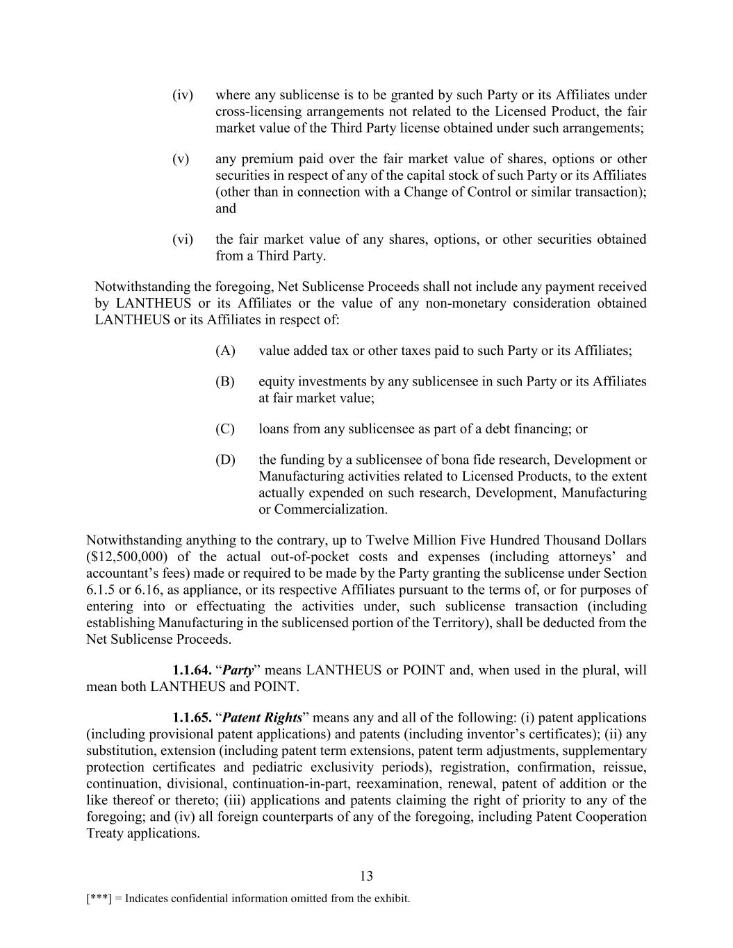 13 [***] = Indicates confidential information omitted from the exhibit. (iv) where any sublicense is to be granted by such Party or its Affiliates under cross-licensing arrangements not related to the Licensed Product, the fair market value of the Third Party license obtained under such arrangements; (v) any premium paid over the fair market value of shares, options or other securities in respect of any of the capital stock of such Party or its Affiliates (other than in connection with a Change of Control or similar transaction); and (vi) the fair market value of any shares, options, or other securities obtained from a Third Party. Notwithstanding the foregoing, Net Sublicense Proceeds shall not include any payment received by LANTHEUS or its Affiliates or the value of any non-monetary consideration obtained LANTHEUS or its Affiliates in respect of: (A) value added tax or other taxes paid to such Party or its Affiliates; (B) equity investments by any sublicensee in such Party or its Affiliates at fair market value; (C) loans from any sublicensee as part of a debt financing; or (D) the funding by a sublicensee of bona fide research, Development or Manufacturing activities related to Licensed Products, to the extent actually expended on such research, Development, Manufacturing or Commercialization. Notwithstanding anything to the contrary, up to Twelve Million Five Hundred Thousand Dollars ($12,500,000) of the actual out-of-pocket costs and expenses (including attorneys’ and accountant’s fees) made or required to be made by the Party granting the sublicense under Section 6.1.5 or 6.16, as appliance, or its respective Affiliates pursuant to the terms of, or for purposes of entering into or effectuating the activities under, such sublicense transaction (including establishing Manufacturing in the sublicensed portion of the Territory), shall be deducted from the Net Sublicense Proceeds. 1.1.64. “Party” means LANTHEUS or POINT and, when used in the plural, will mean both LANTHEUS and POINT. 1.1.65. “Patent Rights” means any and all of the following: (i) patent applications (including provisional patent applications) and patents (including inventor’s certificates); (ii) any substitution, extension (including patent term extensions, patent term adjustments, supplementary protection certificates and pediatric exclusivity periods), registration, confirmation, reissue, continuation, divisional, continuation-in-part, reexamination, renewal, patent of addition or the like thereof or thereto; (iii) applications and patents claiming the right of priority to any of the foregoing; and (iv) all foreign counterparts of any of the foregoing, including Patent Cooperation Treaty applications.