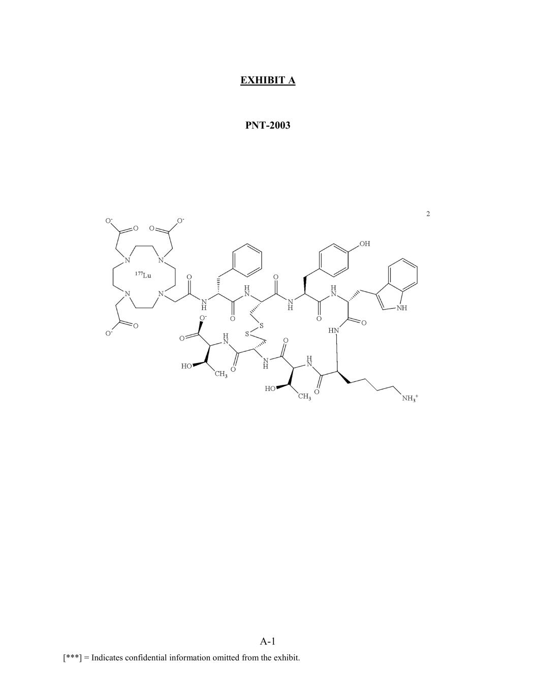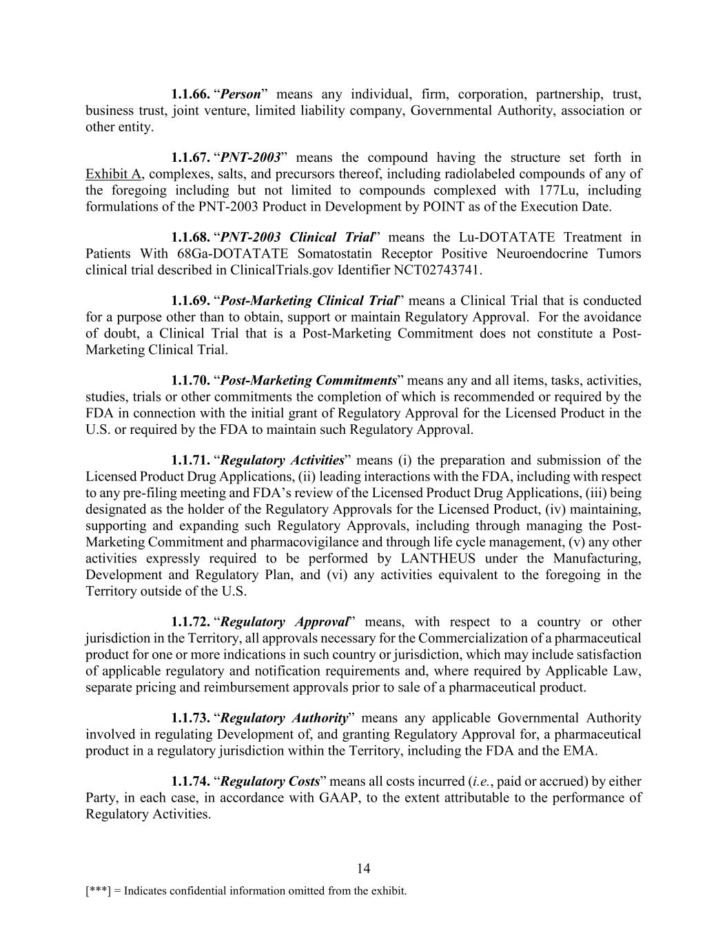 14 [***] = Indicates confidential information omitted from the exhibit. 1.1.66. “Person” means any individual, firm, corporation, partnership, trust, business trust, joint venture, limited liability company, Governmental Authority, association or other entity. 1.1.67. “PNT-2003” means the compound having the structure set forth in Exhibit A, complexes, salts, and precursors thereof, including radiolabeled compounds of any of the foregoing including but not limited to compounds complexed with 177Lu, including formulations of the PNT-2003 Product in Development by POINT as of the Execution Date. 1.1.68. “PNT-2003 Clinical Trial” means the Lu-DOTATATE Treatment in Patients With 68Ga-DOTATATE Somatostatin Receptor Positive Neuroendocrine Tumors clinical trial described in ClinicalTrials.gov Identifier NCT02743741. 1.1.69. “Post-Marketing Clinical Trial” means a Clinical Trial that is conducted for a purpose other than to obtain, support or maintain Regulatory Approval. For the avoidance of doubt, a Clinical Trial that is a Post-Marketing Commitment does not constitute a Post- Marketing Clinical Trial. 1.1.70. “Post-Marketing Commitments” means any and all items, tasks, activities, studies, trials or other commitments the completion of which is recommended or required by the FDA in connection with the initial grant of Regulatory Approval for the Licensed Product in the U.S. or required by the FDA to maintain such Regulatory Approval. 1.1.71. “Regulatory Activities” means (i) the preparation and submission of the Licensed Product Drug Applications, (ii) leading interactions with the FDA, including with respect to any pre-filing meeting and FDA’s review of the Licensed Product Drug Applications, (iii) being designated as the holder of the Regulatory Approvals for the Licensed Product, (iv) maintaining, supporting and expanding such Regulatory Approvals, including through managing the Post- Marketing Commitment and pharmacovigilance and through life cycle management, (v) any other activities expressly required to be performed by LANTHEUS under the Manufacturing, Development and Regulatory Plan, and (vi) any activities equivalent to the foregoing in the Territory outside of the U.S. 1.1.72. “Regulatory Approval” means, with respect to a country or other jurisdiction in the Territory, all approvals necessary for the Commercialization of a pharmaceutical product for one or more indications in such country or jurisdiction, which may include satisfaction of applicable regulatory and notification requirements and, where required by Applicable Law, separate pricing and reimbursement approvals prior to sale of a pharmaceutical product. 1.1.73. “Regulatory Authority” means any applicable Governmental Authority involved in regulating Development of, and granting Regulatory Approval for, a pharmaceutical product in a regulatory jurisdiction within the Territory, including the FDA and the EMA. 1.1.74. “Regulatory Costs” means all costs incurred (i.e., paid or accrued) by either Party, in each case, in accordance with GAAP, to the extent attributable to the performance of Regulatory Activities.