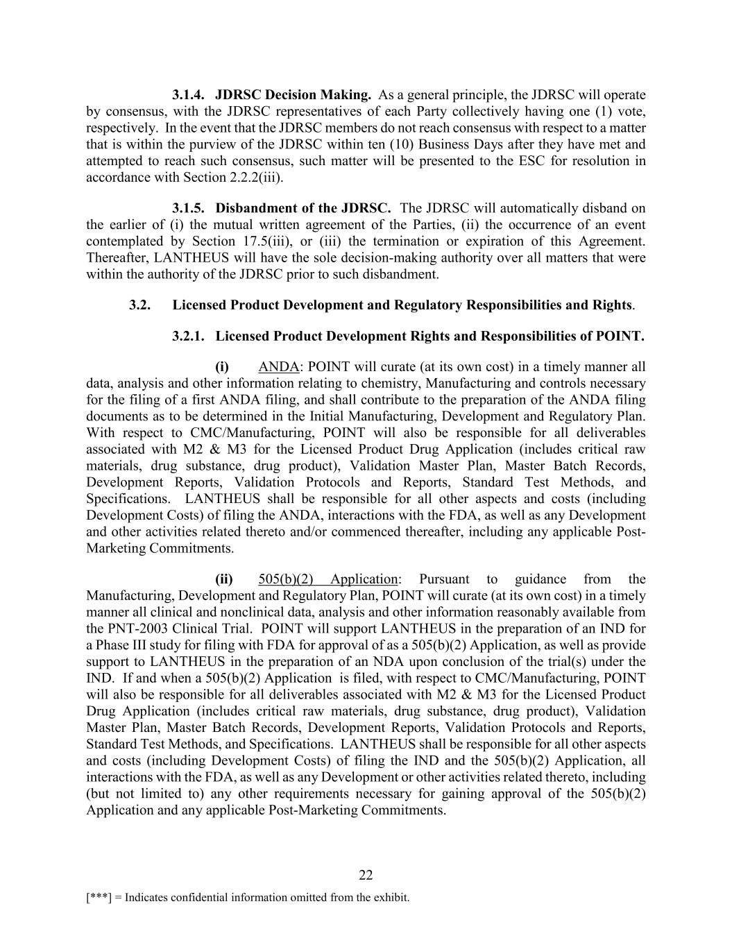 22 [***] = Indicates confidential information omitted from the exhibit. 3.1.4. JDRSC Decision Making. As a general principle, the JDRSC will operate by consensus, with the JDRSC representatives of each Party collectively having one (1) vote, respectively. In the event that the JDRSC members do not reach consensus with respect to a matter that is within the purview of the JDRSC within ten (10) Business Days after they have met and attempted to reach such consensus, such matter will be presented to the ESC for resolution in accordance with Section 2.2.2(iii). 3.1.5. Disbandment of the JDRSC. The JDRSC will automatically disband on the earlier of (i) the mutual written agreement of the Parties, (ii) the occurrence of an event contemplated by Section 17.5(iii), or (iii) the termination or expiration of this Agreement. Thereafter, LANTHEUS will have the sole decision-making authority over all matters that were within the authority of the JDRSC prior to such disbandment. 3.2. Licensed Product Development and Regulatory Responsibilities and Rights. 3.2.1. Licensed Product Development Rights and Responsibilities of POINT. (i) ANDA: POINT will curate (at its own cost) in a timely manner all data, analysis and other information relating to chemistry, Manufacturing and controls necessary for the filing of a first ANDA filing, and shall contribute to the preparation of the ANDA filing documents as to be determined in the Initial Manufacturing, Development and Regulatory Plan. With respect to CMC/Manufacturing, POINT will also be responsible for all deliverables associated with M2 & M3 for the Licensed Product Drug Application (includes critical raw materials, drug substance, drug product), Validation Master Plan, Master Batch Records, Development Reports, Validation Protocols and Reports, Standard Test Methods, and Specifications. LANTHEUS shall be responsible for all other aspects and costs (including Development Costs) of filing the ANDA, interactions with the FDA, as well as any Development and other activities related thereto and/or commenced thereafter, including any applicable Post- Marketing Commitments. (ii) 505(b)(2) Application: Pursuant to guidance from the Manufacturing, Development and Regulatory Plan, POINT will curate (at its own cost) in a timely manner all clinical and nonclinical data, analysis and other information reasonably available from the PNT-2003 Clinical Trial. POINT will support LANTHEUS in the preparation of an IND for a Phase III study for filing with FDA for approval of as a 505(b)(2) Application, as well as provide support to LANTHEUS in the preparation of an NDA upon conclusion of the trial(s) under the IND. If and when a 505(b)(2) Application is filed, with respect to CMC/Manufacturing, POINT will also be responsible for all deliverables associated with M2 & M3 for the Licensed Product Drug Application (includes critical raw materials, drug substance, drug product), Validation Master Plan, Master Batch Records, Development Reports, Validation Protocols and Reports, Standard Test Methods, and Specifications. LANTHEUS shall be responsible for all other aspects and costs (including Development Costs) of filing the IND and the 505(b)(2) Application, all interactions with the FDA, as well as any Development or other activities related thereto, including (but not limited to) any other requirements necessary for gaining approval of the 505(b)(2) Application and any applicable Post-Marketing Commitments.