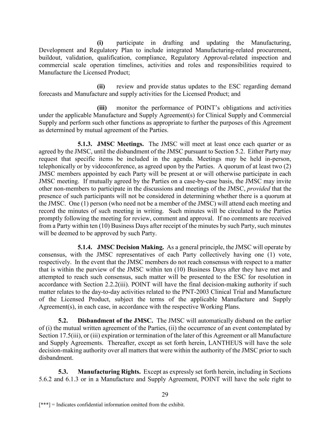 29 [***] = Indicates confidential information omitted from the exhibit. (i) participate in drafting and updating the Manufacturing, Development and Regulatory Plan to include integrated Manufacturing-related procurement, buildout, validation, qualification, compliance, Regulatory Approval-related inspection and commercial scale operation timelines, activities and roles and responsibilities required to Manufacture the Licensed Product; (ii) review and provide status updates to the ESC regarding demand forecasts and Manufacture and supply activities for the Licensed Product; and (iii) monitor the performance of POINT’s obligations and activities under the applicable Manufacture and Supply Agreement(s) for Clinical Supply and Commercial Supply and perform such other functions as appropriate to further the purposes of this Agreement as determined by mutual agreement of the Parties. 5.1.3. JMSC Meetings. The JMSC will meet at least once each quarter or as agreed by the JMSC, until the disbandment of the JMSC pursuant to Section 5.2. Either Party may request that specific items be included in the agenda. Meetings may be held in-person, telephonically or by videoconference, as agreed upon by the Parties. A quorum of at least two (2) JMSC members appointed by each Party will be present at or will otherwise participate in each JMSC meeting. If mutually agreed by the Parties on a case-by-case basis, the JMSC may invite other non-members to participate in the discussions and meetings of the JMSC, provided that the presence of such participants will not be considered in determining whether there is a quorum at the JMSC. One (1) person (who need not be a member of the JMSC) will attend each meeting and record the minutes of such meeting in writing. Such minutes will be circulated to the Parties promptly following the meeting for review, comment and approval. If no comments are received from a Party within ten (10) Business Days after receipt of the minutes by such Party, such minutes will be deemed to be approved by such Party. 5.1.4. JMSC Decision Making. As a general principle, the JMSC will operate by consensus, with the JMSC representatives of each Party collectively having one (1) vote, respectively. In the event that the JMSC members do not reach consensus with respect to a matter that is within the purview of the JMSC within ten (10) Business Days after they have met and attempted to reach such consensus, such matter will be presented to the ESC for resolution in accordance with Section 2.2.2(iii). POINT will have the final decision-making authority if such matter relates to the day-to-day activities related to the PNT-2003 Clinical Trial and Manufacture of the Licensed Product, subject the terms of the applicable Manufacture and Supply Agreement(s), in each case, in accordance with the respective Working Plans. 5.2. Disbandment of the JMSC. The JMSC will automatically disband on the earlier of (i) the mutual written agreement of the Parties, (ii) the occurrence of an event contemplated by Section 17.5(iii), or (iii) expiration or termination of the later of this Agreement or all Manufacture and Supply Agreements. Thereafter, except as set forth herein, LANTHEUS will have the sole decision-making authority over all matters that were within the authority of the JMSC prior to such disbandment. 5.3. Manufacturing Rights. Except as expressly set forth herein, including in Sections 5.6.2 and 6.1.3 or in a Manufacture and Supply Agreement, POINT will have the sole right to