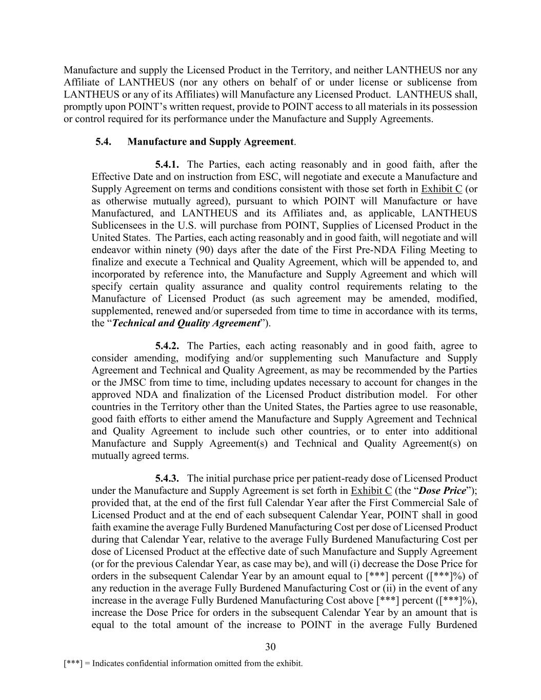 30 [***] = Indicates confidential information omitted from the exhibit. Manufacture and supply the Licensed Product in the Territory, and neither LANTHEUS nor any Affiliate of LANTHEUS (nor any others on behalf of or under license or sublicense from LANTHEUS or any of its Affiliates) will Manufacture any Licensed Product. LANTHEUS shall, promptly upon POINT’s written request, provide to POINT access to all materials in its possession or control required for its performance under the Manufacture and Supply Agreements. 5.4. Manufacture and Supply Agreement. 5.4.1. The Parties, each acting reasonably and in good faith, after the Effective Date and on instruction from ESC, will negotiate and execute a Manufacture and Supply Agreement on terms and conditions consistent with those set forth in Exhibit C (or as otherwise mutually agreed), pursuant to which POINT will Manufacture or have Manufactured, and LANTHEUS and its Affiliates and, as applicable, LANTHEUS Sublicensees in the U.S. will purchase from POINT, Supplies of Licensed Product in the United States. The Parties, each acting reasonably and in good faith, will negotiate and will endeavor within ninety (90) days after the date of the First Pre-NDA Filing Meeting to finalize and execute a Technical and Quality Agreement, which will be appended to, and incorporated by reference into, the Manufacture and Supply Agreement and which will specify certain quality assurance and quality control requirements relating to the Manufacture of Licensed Product (as such agreement may be amended, modified, supplemented, renewed and/or superseded from time to time in accordance with its terms, the “Technical and Quality Agreement”). 5.4.2. The Parties, each acting reasonably and in good faith, agree to consider amending, modifying and/or supplementing such Manufacture and Supply Agreement and Technical and Quality Agreement, as may be recommended by the Parties or the JMSC from time to time, including updates necessary to account for changes in the approved NDA and finalization of the Licensed Product distribution model. For other countries in the Territory other than the United States, the Parties agree to use reasonable, good faith efforts to either amend the Manufacture and Supply Agreement and Technical and Quality Agreement to include such other countries, or to enter into additional Manufacture and Supply Agreement(s) and Technical and Quality Agreement(s) on mutually agreed terms. 5.4.3. The initial purchase price per patient-ready dose of Licensed Product under the Manufacture and Supply Agreement is set forth in Exhibit C (the “Dose Price”); provided that, at the end of the first full Calendar Year after the First Commercial Sale of Licensed Product and at the end of each subsequent Calendar Year, POINT shall in good faith examine the average Fully Burdened Manufacturing Cost per dose of Licensed Product during that Calendar Year, relative to the average Fully Burdened Manufacturing Cost per dose of Licensed Product at the effective date of such Manufacture and Supply Agreement (or for the previous Calendar Year, as case may be), and will (i) decrease the Dose Price for orders in the subsequent Calendar Year by an amount equal to [***] percent ([***]%) of any reduction in the average Fully Burdened Manufacturing Cost or (ii) in the event of any increase in the average Fully Burdened Manufacturing Cost above [***] percent ([***]%), increase the Dose Price for orders in the subsequent Calendar Year by an amount that is equal to the total amount of the increase to POINT in the average Fully Burdened
