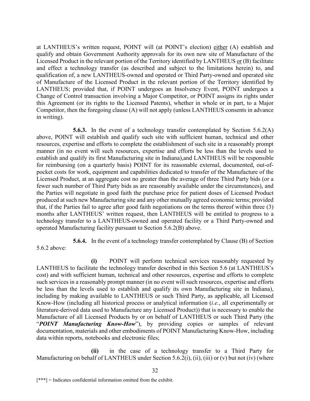 32 [***] = Indicates confidential information omitted from the exhibit. at LANTHEUS’s written request, POINT will (at POINT’s election) either (A) establish and qualify and obtain Government Authority approvals for its own new site of Manufacture of the Licensed Product in the relevant portion of the Territory identified by LANTHEUS or (B) facilitate and effect a technology transfer (as described and subject to the limitations herein) to, and qualification of, a new LANTHEUS-owned and operated or Third Party-owned and operated site of Manufacture of the Licensed Product in the relevant portion of the Territory identified by LANTHEUS; provided that, if POINT undergoes an Insolvency Event, POINT undergoes a Change of Control transaction involving a Major Competitor, or POINT assigns its rights under this Agreement (or its rights to the Licensed Patents), whether in whole or in part, to a Major Competitor, then the foregoing clause (A) will not apply (unless LANTHEUS consents in advance in writing). 5.6.3. In the event of a technology transfer contemplated by Section 5.6.2(A) above, POINT will establish and qualify such site with sufficient human, technical and other resources, expertise and efforts to complete the establishment of such site in a reasonably prompt manner (in no event will such resources, expertise and efforts be less than the levels used to establish and qualify its first Manufacturing site in Indiana),and LANTHEUS will be responsible for reimbursing (on a quarterly basis) POINT for its reasonable external, documented, out-of- pocket costs for work, equipment and capabilities dedicated to transfer of the Manufacture of the Licensed Product, at an aggregate cost no greater than the average of three Third Party bids (or a fewer such number of Third Party bids as are reasonably available under the circumstances), and the Parties will negotiate in good faith the purchase price for patient doses of Licensed Product produced at such new Manufacturing site and any other mutually agreed economic terms; provided that, if the Parties fail to agree after good faith negotiations on the terms thereof within three (3) months after LANTHEUS’ written request, then LANTHEUS will be entitled to progress to a technology transfer to a LANTHEUS-owned and operated facility or a Third Party-owned and operated Manufacturing facility pursuant to Section 5.6.2(B) above. 5.6.4. In the event of a technology transfer contemplated by Clause (B) of Section 5.6.2 above: (i) POINT will perform technical services reasonably requested by LANTHEUS to facilitate the technology transfer described in this Section 5.6 (at LANTHEUS’s cost) and with sufficient human, technical and other resources, expertise and efforts to complete such services in a reasonably prompt manner (in no event will such resources, expertise and efforts be less than the levels used to establish and qualify its own Manufacturing site in Indiana), including by making available to LANTHEUS or such Third Party, as applicable, all Licensed Know-How (including all historical process or analytical information (i.e., all experimentally or literature-derived data used to Manufacture any Licensed Product)) that is necessary to enable the Manufacture of all Licensed Products by or on behalf of LANTHEUS or such Third Party (the “POINT Manufacturing Know-How”), by providing copies or samples of relevant documentation, materials and other embodiments of POINT Manufacturing Know-How, including data within reports, notebooks and electronic files; (ii) in the case of a technology transfer to a Third Party for Manufacturing on behalf of LANTHEUS under Section 5.6.2(i), (ii), (iii) or (v) but not (iv) (where