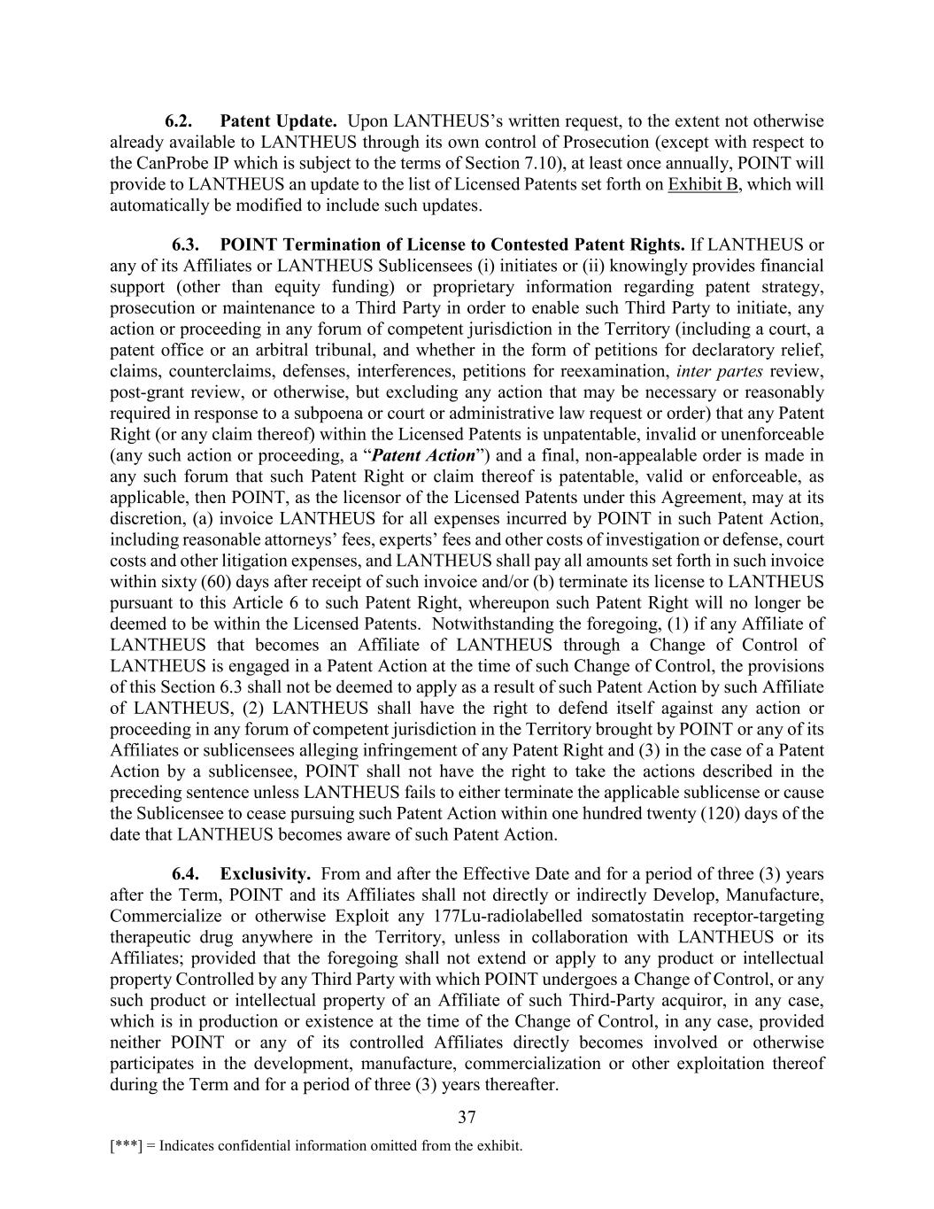 37 [***] = Indicates confidential information omitted from the exhibit. 6.2. Patent Update. Upon LANTHEUS’s written request, to the extent not otherwise already available to LANTHEUS through its own control of Prosecution (except with respect to the CanProbe IP which is subject to the terms of Section 7.10), at least once annually, POINT will provide to LANTHEUS an update to the list of Licensed Patents set forth on Exhibit B, which will automatically be modified to include such updates. 6.3. POINT Termination of License to Contested Patent Rights. If LANTHEUS or any of its Affiliates or LANTHEUS Sublicensees (i) initiates or (ii) knowingly provides financial support (other than equity funding) or proprietary information regarding patent strategy, prosecution or maintenance to a Third Party in order to enable such Third Party to initiate, any action or proceeding in any forum of competent jurisdiction in the Territory (including a court, a patent office or an arbitral tribunal, and whether in the form of petitions for declaratory relief, claims, counterclaims, defenses, interferences, petitions for reexamination, inter partes review, post-grant review, or otherwise, but excluding any action that may be necessary or reasonably required in response to a subpoena or court or administrative law request or order) that any Patent Right (or any claim thereof) within the Licensed Patents is unpatentable, invalid or unenforceable (any such action or proceeding, a “Patent Action”) and a final, non-appealable order is made in any such forum that such Patent Right or claim thereof is patentable, valid or enforceable, as applicable, then POINT, as the licensor of the Licensed Patents under this Agreement, may at its discretion, (a) invoice LANTHEUS for all expenses incurred by POINT in such Patent Action, including reasonable attorneys’ fees, experts’ fees and other costs of investigation or defense, court costs and other litigation expenses, and LANTHEUS shall pay all amounts set forth in such invoice within sixty (60) days after receipt of such invoice and/or (b) terminate its license to LANTHEUS pursuant to this Article 6 to such Patent Right, whereupon such Patent Right will no longer be deemed to be within the Licensed Patents. Notwithstanding the foregoing, (1) if any Affiliate of LANTHEUS that becomes an Affiliate of LANTHEUS through a Change of Control of LANTHEUS is engaged in a Patent Action at the time of such Change of Control, the provisions of this Section 6.3 shall not be deemed to apply as a result of such Patent Action by such Affiliate of LANTHEUS, (2) LANTHEUS shall have the right to defend itself against any action or proceeding in any forum of competent jurisdiction in the Territory brought by POINT or any of its Affiliates or sublicensees alleging infringement of any Patent Right and (3) in the case of a Patent Action by a sublicensee, POINT shall not have the right to take the actions described in the preceding sentence unless LANTHEUS fails to either terminate the applicable sublicense or cause the Sublicensee to cease pursuing such Patent Action within one hundred twenty (120) days of the date that LANTHEUS becomes aware of such Patent Action. 6.4. Exclusivity. From and after the Effective Date and for a period of three (3) years after the Term, POINT and its Affiliates shall not directly or indirectly Develop, Manufacture, Commercialize or otherwise Exploit any 177Lu-radiolabelled somatostatin receptor-targeting therapeutic drug anywhere in the Territory, unless in collaboration with LANTHEUS or its Affiliates; provided that the foregoing shall not extend or apply to any product or intellectual property Controlled by any Third Party with which POINT undergoes a Change of Control, or any such product or intellectual property of an Affiliate of such Third-Party acquiror, in any case, which is in production or existence at the time of the Change of Control, in any case, provided neither POINT or any of its controlled Affiliates directly becomes involved or otherwise participates in the development, manufacture, commercialization or other exploitation thereof during the Term and for a period of three (3) years thereafter.