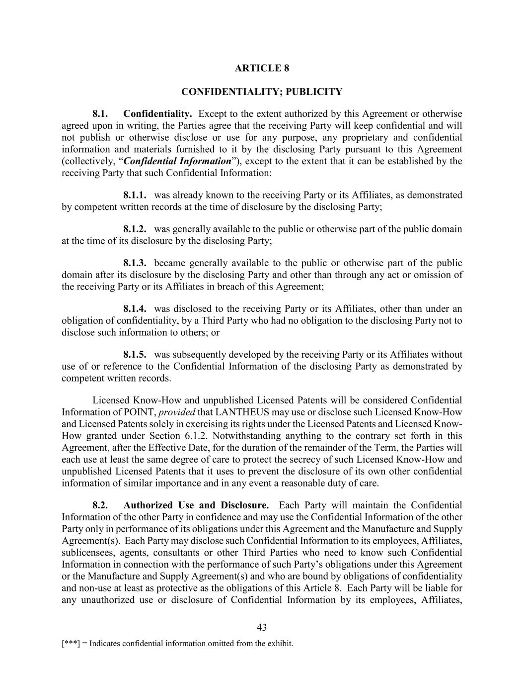 43 [***] = Indicates confidential information omitted from the exhibit. ARTICLE 8 CONFIDENTIALITY; PUBLICITY 8.1. Confidentiality. Except to the extent authorized by this Agreement or otherwise agreed upon in writing, the Parties agree that the receiving Party will keep confidential and will not publish or otherwise disclose or use for any purpose, any proprietary and confidential information and materials furnished to it by the disclosing Party pursuant to this Agreement (collectively, “Confidential Information”), except to the extent that it can be established by the receiving Party that such Confidential Information: 8.1.1. was already known to the receiving Party or its Affiliates, as demonstrated by competent written records at the time of disclosure by the disclosing Party; 8.1.2. was generally available to the public or otherwise part of the public domain at the time of its disclosure by the disclosing Party; 8.1.3. became generally available to the public or otherwise part of the public domain after its disclosure by the disclosing Party and other than through any act or omission of the receiving Party or its Affiliates in breach of this Agreement; 8.1.4. was disclosed to the receiving Party or its Affiliates, other than under an obligation of confidentiality, by a Third Party who had no obligation to the disclosing Party not to disclose such information to others; or 8.1.5. was subsequently developed by the receiving Party or its Affiliates without use of or reference to the Confidential Information of the disclosing Party as demonstrated by competent written records. Licensed Know-How and unpublished Licensed Patents will be considered Confidential Information of POINT, provided that LANTHEUS may use or disclose such Licensed Know-How and Licensed Patents solely in exercising its rights under the Licensed Patents and Licensed Know- How granted under Section 6.1.2. Notwithstanding anything to the contrary set forth in this Agreement, after the Effective Date, for the duration of the remainder of the Term, the Parties will each use at least the same degree of care to protect the secrecy of such Licensed Know-How and unpublished Licensed Patents that it uses to prevent the disclosure of its own other confidential information of similar importance and in any event a reasonable duty of care. 8.2. Authorized Use and Disclosure. Each Party will maintain the Confidential Information of the other Party in confidence and may use the Confidential Information of the other Party only in performance of its obligations under this Agreement and the Manufacture and Supply Agreement(s). Each Party may disclose such Confidential Information to its employees, Affiliates, sublicensees, agents, consultants or other Third Parties who need to know such Confidential Information in connection with the performance of such Party’s obligations under this Agreement or the Manufacture and Supply Agreement(s) and who are bound by obligations of confidentiality and non-use at least as protective as the obligations of this Article 8. Each Party will be liable for any unauthorized use or disclosure of Confidential Information by its employees, Affiliates,