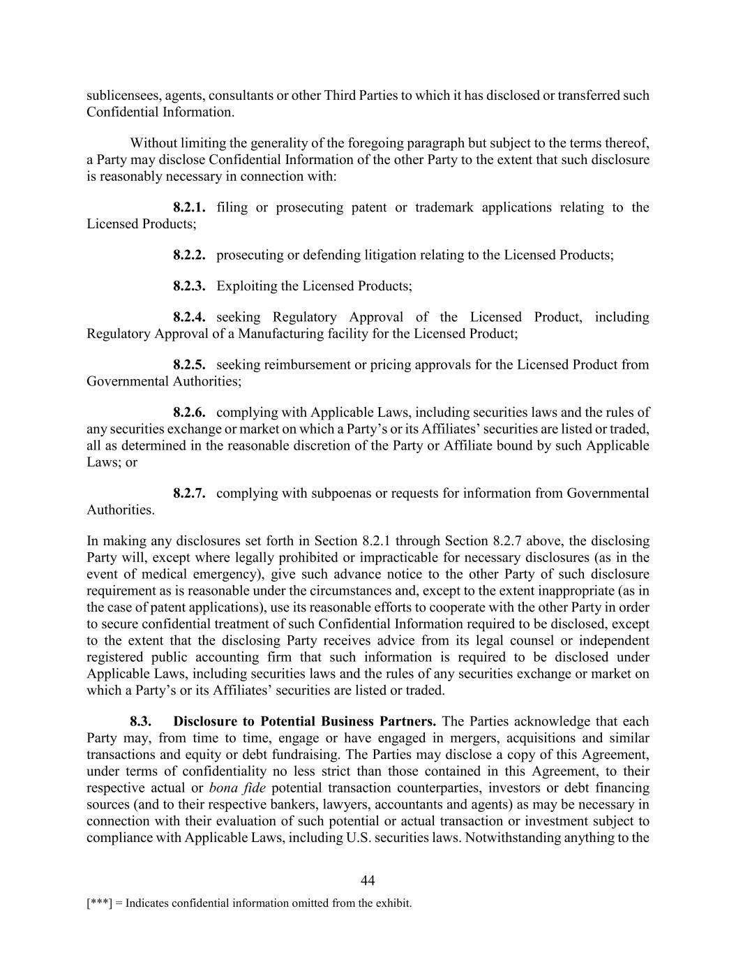 44 [***] = Indicates confidential information omitted from the exhibit. sublicensees, agents, consultants or other Third Parties to which it has disclosed or transferred such Confidential Information. Without limiting the generality of the foregoing paragraph but subject to the terms thereof, a Party may disclose Confidential Information of the other Party to the extent that such disclosure is reasonably necessary in connection with: 8.2.1. filing or prosecuting patent or trademark applications relating to the Licensed Products; 8.2.2. prosecuting or defending litigation relating to the Licensed Products; 8.2.3. Exploiting the Licensed Products; 8.2.4. seeking Regulatory Approval of the Licensed Product, including Regulatory Approval of a Manufacturing facility for the Licensed Product; 8.2.5. seeking reimbursement or pricing approvals for the Licensed Product from Governmental Authorities; 8.2.6. complying with Applicable Laws, including securities laws and the rules of any securities exchange or market on which a Party’s or its Affiliates’ securities are listed or traded, all as determined in the reasonable discretion of the Party or Affiliate bound by such Applicable Laws; or 8.2.7. complying with subpoenas or requests for information from Governmental Authorities. In making any disclosures set forth in Section 8.2.1 through Section 8.2.7 above, the disclosing Party will, except where legally prohibited or impracticable for necessary disclosures (as in the event of medical emergency), give such advance notice to the other Party of such disclosure requirement as is reasonable under the circumstances and, except to the extent inappropriate (as in the case of patent applications), use its reasonable efforts to cooperate with the other Party in order to secure confidential treatment of such Confidential Information required to be disclosed, except to the extent that the disclosing Party receives advice from its legal counsel or independent registered public accounting firm that such information is required to be disclosed under Applicable Laws, including securities laws and the rules of any securities exchange or market on which a Party’s or its Affiliates’ securities are listed or traded. 8.3. Disclosure to Potential Business Partners. The Parties acknowledge that each Party may, from time to time, engage or have engaged in mergers, acquisitions and similar transactions and equity or debt fundraising. The Parties may disclose a copy of this Agreement, under terms of confidentiality no less strict than those contained in this Agreement, to their respective actual or bona fide potential transaction counterparties, investors or debt financing sources (and to their respective bankers, lawyers, accountants and agents) as may be necessary in connection with their evaluation of such potential or actual transaction or investment subject to compliance with Applicable Laws, including U.S. securities laws. Notwithstanding anything to the