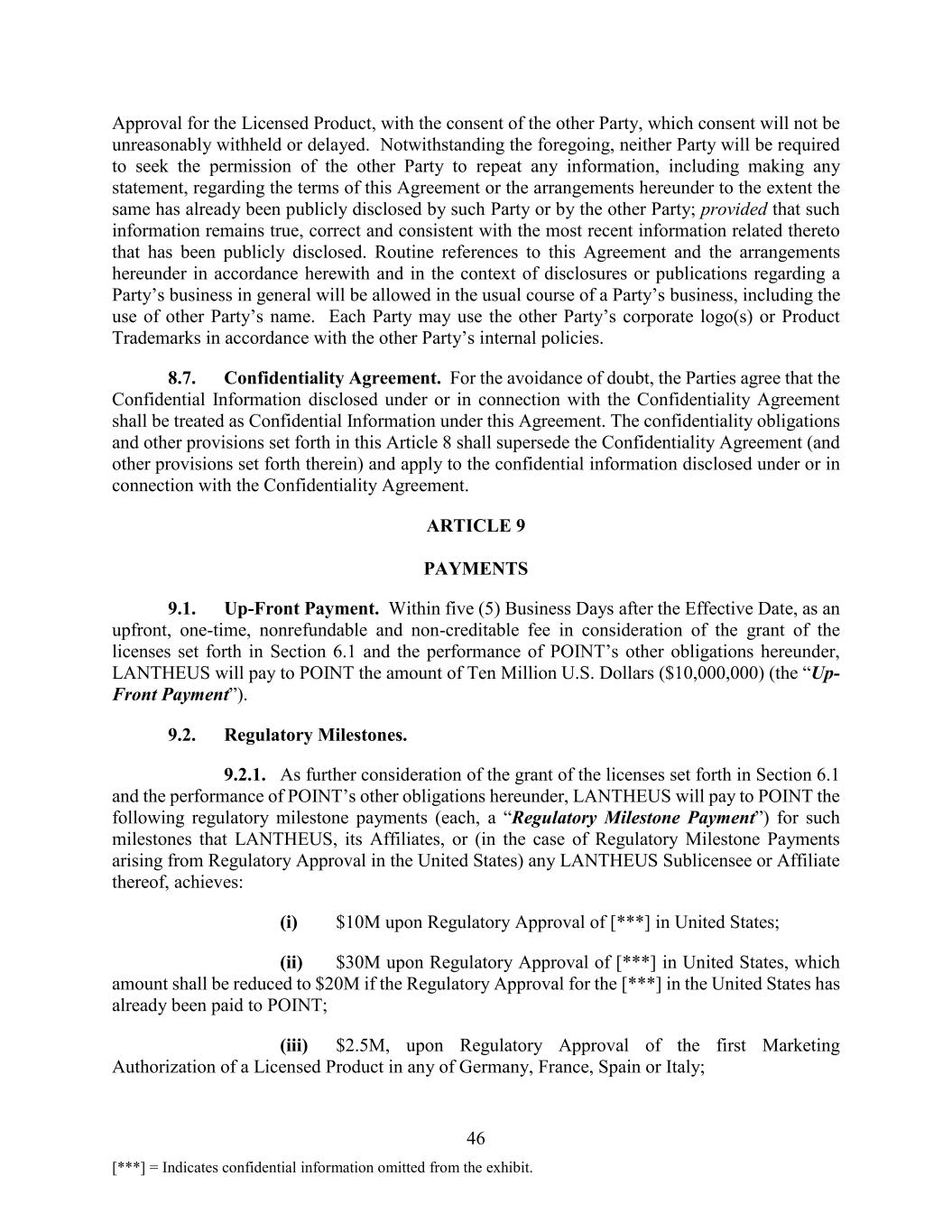 46 [***] = Indicates confidential information omitted from the exhibit. Approval for the Licensed Product, with the consent of the other Party, which consent will not be unreasonably withheld or delayed. Notwithstanding the foregoing, neither Party will be required to seek the permission of the other Party to repeat any information, including making any statement, regarding the terms of this Agreement or the arrangements hereunder to the extent the same has already been publicly disclosed by such Party or by the other Party; provided that such information remains true, correct and consistent with the most recent information related thereto that has been publicly disclosed. Routine references to this Agreement and the arrangements hereunder in accordance herewith and in the context of disclosures or publications regarding a Party’s business in general will be allowed in the usual course of a Party’s business, including the use of other Party’s name. Each Party may use the other Party’s corporate logo(s) or Product Trademarks in accordance with the other Party’s internal policies. 8.7. Confidentiality Agreement. For the avoidance of doubt, the Parties agree that the Confidential Information disclosed under or in connection with the Confidentiality Agreement shall be treated as Confidential Information under this Agreement. The confidentiality obligations and other provisions set forth in this Article 8 shall supersede the Confidentiality Agreement (and other provisions set forth therein) and apply to the confidential information disclosed under or in connection with the Confidentiality Agreement. ARTICLE 9 PAYMENTS 9.1. Up-Front Payment. Within five (5) Business Days after the Effective Date, as an upfront, one-time, nonrefundable and non-creditable fee in consideration of the grant of the licenses set forth in Section 6.1 and the performance of POINT’s other obligations hereunder, LANTHEUS will pay to POINT the amount of Ten Million U.S. Dollars ($10,000,000) (the “Up- Front Payment”). 9.2. Regulatory Milestones. 9.2.1. As further consideration of the grant of the licenses set forth in Section 6.1 and the performance of POINT’s other obligations hereunder, LANTHEUS will pay to POINT the following regulatory milestone payments (each, a “Regulatory Milestone Payment”) for such milestones that LANTHEUS, its Affiliates, or (in the case of Regulatory Milestone Payments arising from Regulatory Approval in the United States) any LANTHEUS Sublicensee or Affiliate thereof, achieves: (i) $10M upon Regulatory Approval of [***] in United States; (ii) $30M upon Regulatory Approval of [***] in United States, which amount shall be reduced to $20M if the Regulatory Approval for the [***] in the United States has already been paid to POINT; (iii) $2.5M, upon Regulatory Approval of the first Marketing Authorization of a Licensed Product in any of Germany, France, Spain or Italy;