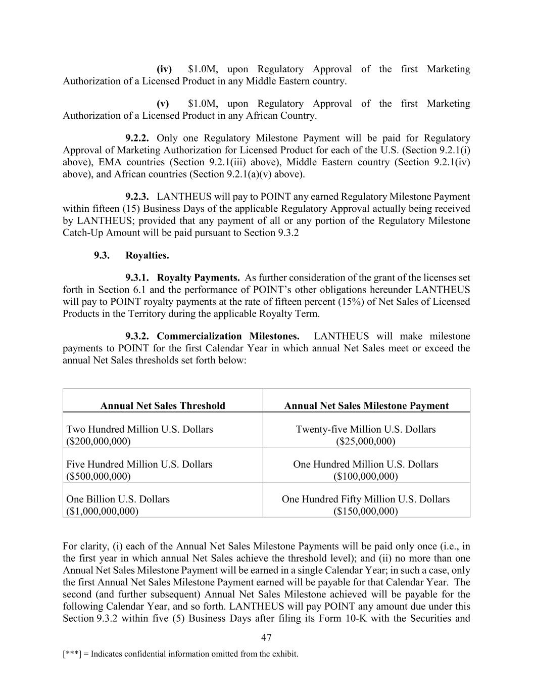 47 [***] = Indicates confidential information omitted from the exhibit. (iv) $1.0M, upon Regulatory Approval of the first Marketing Authorization of a Licensed Product in any Middle Eastern country. (v) $1.0M, upon Regulatory Approval of the first Marketing Authorization of a Licensed Product in any African Country. 9.2.2. Only one Regulatory Milestone Payment will be paid for Regulatory Approval of Marketing Authorization for Licensed Product for each of the U.S. (Section 9.2.1(i) above), EMA countries (Section 9.2.1(iii) above), Middle Eastern country (Section 9.2.1(iv) above), and African countries (Section 9.2.1(a)(v) above). 9.2.3. LANTHEUS will pay to POINT any earned Regulatory Milestone Payment within fifteen (15) Business Days of the applicable Regulatory Approval actually being received by LANTHEUS; provided that any payment of all or any portion of the Regulatory Milestone Catch-Up Amount will be paid pursuant to Section 9.3.2 9.3. Royalties. 9.3.1. Royalty Payments. As further consideration of the grant of the licenses set forth in Section 6.1 and the performance of POINT’s other obligations hereunder LANTHEUS will pay to POINT royalty payments at the rate of fifteen percent (15%) of Net Sales of Licensed Products in the Territory during the applicable Royalty Term. 9.3.2. Commercialization Milestones. LANTHEUS will make milestone payments to POINT for the first Calendar Year in which annual Net Sales meet or exceed the annual Net Sales thresholds set forth below: Annual Net Sales Threshold Annual Net Sales Milestone Payment Two Hundred Million U.S. Dollars ($200,000,000) Twenty-five Million U.S. Dollars ($25,000,000) Five Hundred Million U.S. Dollars ($500,000,000) One Hundred Million U.S. Dollars ($100,000,000) One Billion U.S. Dollars ($1,000,000,000) One Hundred Fifty Million U.S. Dollars ($150,000,000) For clarity, (i) each of the Annual Net Sales Milestone Payments will be paid only once (i.e., in the first year in which annual Net Sales achieve the threshold level); and (ii) no more than one Annual Net Sales Milestone Payment will be earned in a single Calendar Year; in such a case, only the first Annual Net Sales Milestone Payment earned will be payable for that Calendar Year. The second (and further subsequent) Annual Net Sales Milestone achieved will be payable for the following Calendar Year, and so forth. LANTHEUS will pay POINT any amount due under this Section 9.3.2 within five (5) Business Days after filing its Form 10-K with the Securities and