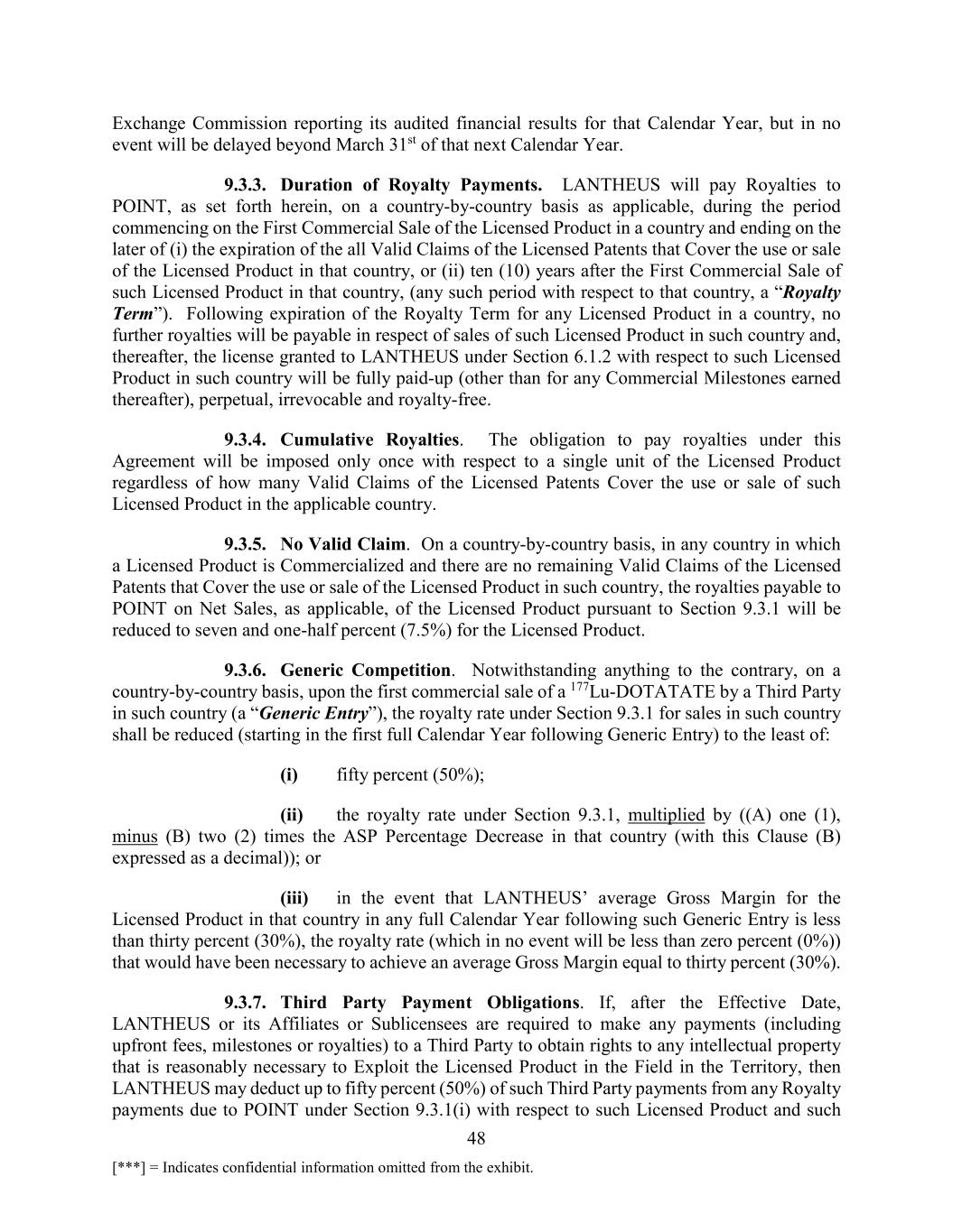 48 [***] = Indicates confidential information omitted from the exhibit. Exchange Commission reporting its audited financial results for that Calendar Year, but in no event will be delayed beyond March 31st of that next Calendar Year. 9.3.3. Duration of Royalty Payments. LANTHEUS will pay Royalties to POINT, as set forth herein, on a country-by-country basis as applicable, during the period commencing on the First Commercial Sale of the Licensed Product in a country and ending on the later of (i) the expiration of the all Valid Claims of the Licensed Patents that Cover the use or sale of the Licensed Product in that country, or (ii) ten (10) years after the First Commercial Sale of such Licensed Product in that country, (any such period with respect to that country, a “Royalty Term”). Following expiration of the Royalty Term for any Licensed Product in a country, no further royalties will be payable in respect of sales of such Licensed Product in such country and, thereafter, the license granted to LANTHEUS under Section 6.1.2 with respect to such Licensed Product in such country will be fully paid-up (other than for any Commercial Milestones earned thereafter), perpetual, irrevocable and royalty-free. 9.3.4. Cumulative Royalties. The obligation to pay royalties under this Agreement will be imposed only once with respect to a single unit of the Licensed Product regardless of how many Valid Claims of the Licensed Patents Cover the use or sale of such Licensed Product in the applicable country. 9.3.5. No Valid Claim. On a country-by-country basis, in any country in which a Licensed Product is Commercialized and there are no remaining Valid Claims of the Licensed Patents that Cover the use or sale of the Licensed Product in such country, the royalties payable to POINT on Net Sales, as applicable, of the Licensed Product pursuant to Section 9.3.1 will be reduced to seven and one-half percent (7.5%) for the Licensed Product. 9.3.6. Generic Competition. Notwithstanding anything to the contrary, on a country-by-country basis, upon the first commercial sale of a 177Lu-DOTATATE by a Third Party in such country (a “Generic Entry”), the royalty rate under Section 9.3.1 for sales in such country shall be reduced (starting in the first full Calendar Year following Generic Entry) to the least of: (i) fifty percent (50%); (ii) the royalty rate under Section 9.3.1, multiplied by ((A) one (1), minus (B) two (2) times the ASP Percentage Decrease in that country (with this Clause (B) expressed as a decimal)); or (iii) in the event that LANTHEUS’ average Gross Margin for the Licensed Product in that country in any full Calendar Year following such Generic Entry is less than thirty percent (30%), the royalty rate (which in no event will be less than zero percent (0%)) that would have been necessary to achieve an average Gross Margin equal to thirty percent (30%). 9.3.7. Third Party Payment Obligations. If, after the Effective Date, LANTHEUS or its Affiliates or Sublicensees are required to make any payments (including upfront fees, milestones or royalties) to a Third Party to obtain rights to any intellectual property that is reasonably necessary to Exploit the Licensed Product in the Field in the Territory, then LANTHEUS may deduct up to fifty percent (50%) of such Third Party payments from any Royalty payments due to POINT under Section 9.3.1(i) with respect to such Licensed Product and such