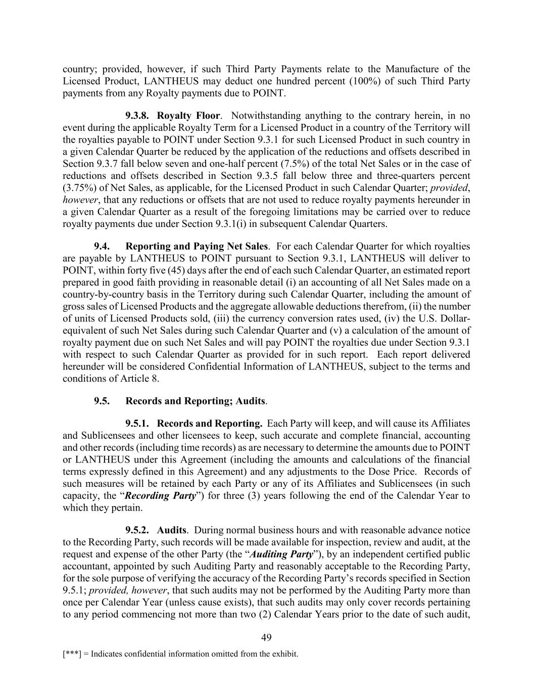 49 [***] = Indicates confidential information omitted from the exhibit. country; provided, however, if such Third Party Payments relate to the Manufacture of the Licensed Product, LANTHEUS may deduct one hundred percent (100%) of such Third Party payments from any Royalty payments due to POINT. 9.3.8. Royalty Floor. Notwithstanding anything to the contrary herein, in no event during the applicable Royalty Term for a Licensed Product in a country of the Territory will the royalties payable to POINT under Section 9.3.1 for such Licensed Product in such country in a given Calendar Quarter be reduced by the application of the reductions and offsets described in Section 9.3.7 fall below seven and one-half percent (7.5%) of the total Net Sales or in the case of reductions and offsets described in Section 9.3.5 fall below three and three-quarters percent (3.75%) of Net Sales, as applicable, for the Licensed Product in such Calendar Quarter; provided, however, that any reductions or offsets that are not used to reduce royalty payments hereunder in a given Calendar Quarter as a result of the foregoing limitations may be carried over to reduce royalty payments due under Section 9.3.1(i) in subsequent Calendar Quarters. 9.4. Reporting and Paying Net Sales. For each Calendar Quarter for which royalties are payable by LANTHEUS to POINT pursuant to Section 9.3.1, LANTHEUS will deliver to POINT, within forty five (45) days after the end of each such Calendar Quarter, an estimated report prepared in good faith providing in reasonable detail (i) an accounting of all Net Sales made on a country-by-country basis in the Territory during such Calendar Quarter, including the amount of gross sales of Licensed Products and the aggregate allowable deductions therefrom, (ii) the number of units of Licensed Products sold, (iii) the currency conversion rates used, (iv) the U.S. Dollar- equivalent of such Net Sales during such Calendar Quarter and (v) a calculation of the amount of royalty payment due on such Net Sales and will pay POINT the royalties due under Section 9.3.1 with respect to such Calendar Quarter as provided for in such report. Each report delivered hereunder will be considered Confidential Information of LANTHEUS, subject to the terms and conditions of Article 8. 9.5. Records and Reporting; Audits. 9.5.1. Records and Reporting. Each Party will keep, and will cause its Affiliates and Sublicensees and other licensees to keep, such accurate and complete financial, accounting and other records (including time records) as are necessary to determine the amounts due to POINT or LANTHEUS under this Agreement (including the amounts and calculations of the financial terms expressly defined in this Agreement) and any adjustments to the Dose Price. Records of such measures will be retained by each Party or any of its Affiliates and Sublicensees (in such capacity, the “Recording Party”) for three (3) years following the end of the Calendar Year to which they pertain. 9.5.2. Audits. During normal business hours and with reasonable advance notice to the Recording Party, such records will be made available for inspection, review and audit, at the request and expense of the other Party (the “Auditing Party”), by an independent certified public accountant, appointed by such Auditing Party and reasonably acceptable to the Recording Party, for the sole purpose of verifying the accuracy of the Recording Party’s records specified in Section 9.5.1; provided, however, that such audits may not be performed by the Auditing Party more than once per Calendar Year (unless cause exists), that such audits may only cover records pertaining to any period commencing not more than two (2) Calendar Years prior to the date of such audit,