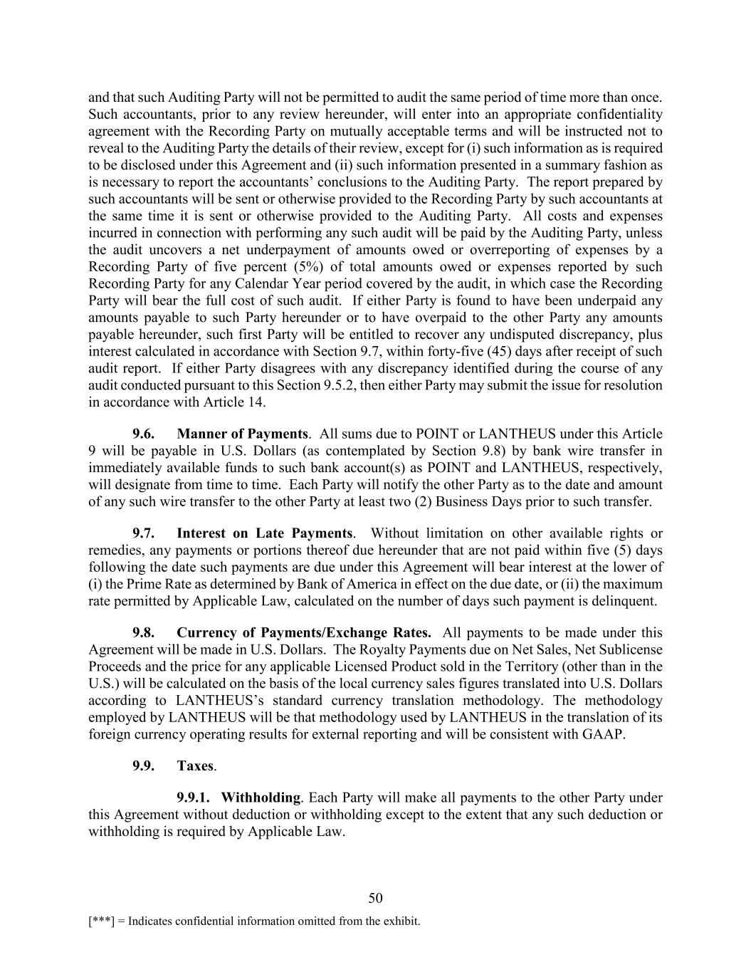 50 [***] = Indicates confidential information omitted from the exhibit. and that such Auditing Party will not be permitted to audit the same period of time more than once. Such accountants, prior to any review hereunder, will enter into an appropriate confidentiality agreement with the Recording Party on mutually acceptable terms and will be instructed not to reveal to the Auditing Party the details of their review, except for (i) such information as is required to be disclosed under this Agreement and (ii) such information presented in a summary fashion as is necessary to report the accountants’ conclusions to the Auditing Party. The report prepared by such accountants will be sent or otherwise provided to the Recording Party by such accountants at the same time it is sent or otherwise provided to the Auditing Party. All costs and expenses incurred in connection with performing any such audit will be paid by the Auditing Party, unless the audit uncovers a net underpayment of amounts owed or overreporting of expenses by a Recording Party of five percent (5%) of total amounts owed or expenses reported by such Recording Party for any Calendar Year period covered by the audit, in which case the Recording Party will bear the full cost of such audit. If either Party is found to have been underpaid any amounts payable to such Party hereunder or to have overpaid to the other Party any amounts payable hereunder, such first Party will be entitled to recover any undisputed discrepancy, plus interest calculated in accordance with Section 9.7, within forty-five (45) days after receipt of such audit report. If either Party disagrees with any discrepancy identified during the course of any audit conducted pursuant to this Section 9.5.2, then either Party may submit the issue for resolution in accordance with Article 14. 9.6. Manner of Payments. All sums due to POINT or LANTHEUS under this Article 9 will be payable in U.S. Dollars (as contemplated by Section 9.8) by bank wire transfer in immediately available funds to such bank account(s) as POINT and LANTHEUS, respectively, will designate from time to time. Each Party will notify the other Party as to the date and amount of any such wire transfer to the other Party at least two (2) Business Days prior to such transfer. 9.7. Interest on Late Payments. Without limitation on other available rights or remedies, any payments or portions thereof due hereunder that are not paid within five (5) days following the date such payments are due under this Agreement will bear interest at the lower of (i) the Prime Rate as determined by Bank of America in effect on the due date, or (ii) the maximum rate permitted by Applicable Law, calculated on the number of days such payment is delinquent. 9.8. Currency of Payments/Exchange Rates. All payments to be made under this Agreement will be made in U.S. Dollars. The Royalty Payments due on Net Sales, Net Sublicense Proceeds and the price for any applicable Licensed Product sold in the Territory (other than in the U.S.) will be calculated on the basis of the local currency sales figures translated into U.S. Dollars according to LANTHEUS’s standard currency translation methodology. The methodology employed by LANTHEUS will be that methodology used by LANTHEUS in the translation of its foreign currency operating results for external reporting and will be consistent with GAAP. 9.9. Taxes. 9.9.1. Withholding. Each Party will make all payments to the other Party under this Agreement without deduction or withholding except to the extent that any such deduction or withholding is required by Applicable Law.