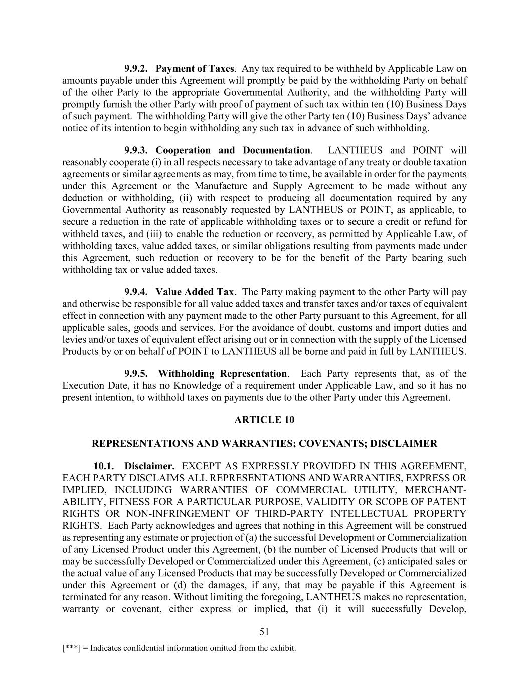 51 [***] = Indicates confidential information omitted from the exhibit. 9.9.2. Payment of Taxes. Any tax required to be withheld by Applicable Law on amounts payable under this Agreement will promptly be paid by the withholding Party on behalf of the other Party to the appropriate Governmental Authority, and the withholding Party will promptly furnish the other Party with proof of payment of such tax within ten (10) Business Days of such payment. The withholding Party will give the other Party ten (10) Business Days’ advance notice of its intention to begin withholding any such tax in advance of such withholding. 9.9.3. Cooperation and Documentation. LANTHEUS and POINT will reasonably cooperate (i) in all respects necessary to take advantage of any treaty or double taxation agreements or similar agreements as may, from time to time, be available in order for the payments under this Agreement or the Manufacture and Supply Agreement to be made without any deduction or withholding, (ii) with respect to producing all documentation required by any Governmental Authority as reasonably requested by LANTHEUS or POINT, as applicable, to secure a reduction in the rate of applicable withholding taxes or to secure a credit or refund for withheld taxes, and (iii) to enable the reduction or recovery, as permitted by Applicable Law, of withholding taxes, value added taxes, or similar obligations resulting from payments made under this Agreement, such reduction or recovery to be for the benefit of the Party bearing such withholding tax or value added taxes. 9.9.4. Value Added Tax. The Party making payment to the other Party will pay and otherwise be responsible for all value added taxes and transfer taxes and/or taxes of equivalent effect in connection with any payment made to the other Party pursuant to this Agreement, for all applicable sales, goods and services. For the avoidance of doubt, customs and import duties and levies and/or taxes of equivalent effect arising out or in connection with the supply of the Licensed Products by or on behalf of POINT to LANTHEUS all be borne and paid in full by LANTHEUS. 9.9.5. Withholding Representation. Each Party represents that, as of the Execution Date, it has no Knowledge of a requirement under Applicable Law, and so it has no present intention, to withhold taxes on payments due to the other Party under this Agreement. ARTICLE 10 REPRESENTATIONS AND WARRANTIES; COVENANTS; DISCLAIMER 10.1. Disclaimer. EXCEPT AS EXPRESSLY PROVIDED IN THIS AGREEMENT, EACH PARTY DISCLAIMS ALL REPRESENTATIONS AND WARRANTIES, EXPRESS OR IMPLIED, INCLUDING WARRANTIES OF COMMERCIAL UTILITY, MERCHANT- ABILITY, FITNESS FOR A PARTICULAR PURPOSE, VALIDITY OR SCOPE OF PATENT RIGHTS OR NON-INFRINGEMENT OF THIRD-PARTY INTELLECTUAL PROPERTY RIGHTS. Each Party acknowledges and agrees that nothing in this Agreement will be construed as representing any estimate or projection of (a) the successful Development or Commercialization of any Licensed Product under this Agreement, (b) the number of Licensed Products that will or may be successfully Developed or Commercialized under this Agreement, (c) anticipated sales or the actual value of any Licensed Products that may be successfully Developed or Commercialized under this Agreement or (d) the damages, if any, that may be payable if this Agreement is terminated for any reason. Without limiting the foregoing, LANTHEUS makes no representation, warranty or covenant, either express or implied, that (i) it will successfully Develop,
