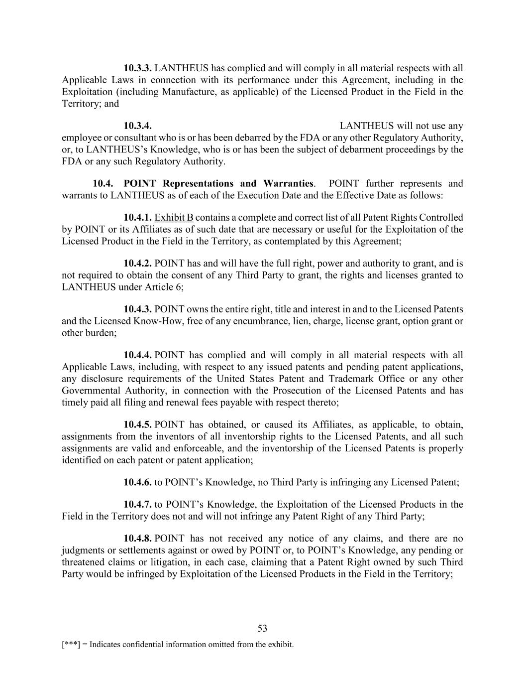 53 [***] = Indicates confidential information omitted from the exhibit. 10.3.3. LANTHEUS has complied and will comply in all material respects with all Applicable Laws in connection with its performance under this Agreement, including in the Exploitation (including Manufacture, as applicable) of the Licensed Product in the Field in the Territory; and 10.3.4. LANTHEUS will not use any employee or consultant who is or has been debarred by the FDA or any other Regulatory Authority, or, to LANTHEUS’s Knowledge, who is or has been the subject of debarment proceedings by the FDA or any such Regulatory Authority. 10.4. POINT Representations and Warranties. POINT further represents and warrants to LANTHEUS as of each of the Execution Date and the Effective Date as follows: 10.4.1. Exhibit B contains a complete and correct list of all Patent Rights Controlled by POINT or its Affiliates as of such date that are necessary or useful for the Exploitation of the Licensed Product in the Field in the Territory, as contemplated by this Agreement; 10.4.2. POINT has and will have the full right, power and authority to grant, and is not required to obtain the consent of any Third Party to grant, the rights and licenses granted to LANTHEUS under Article 6; 10.4.3. POINT owns the entire right, title and interest in and to the Licensed Patents and the Licensed Know-How, free of any encumbrance, lien, charge, license grant, option grant or other burden; 10.4.4. POINT has complied and will comply in all material respects with all Applicable Laws, including, with respect to any issued patents and pending patent applications, any disclosure requirements of the United States Patent and Trademark Office or any other Governmental Authority, in connection with the Prosecution of the Licensed Patents and has timely paid all filing and renewal fees payable with respect thereto; 10.4.5. POINT has obtained, or caused its Affiliates, as applicable, to obtain, assignments from the inventors of all inventorship rights to the Licensed Patents, and all such assignments are valid and enforceable, and the inventorship of the Licensed Patents is properly identified on each patent or patent application; 10.4.6. to POINT’s Knowledge, no Third Party is infringing any Licensed Patent; 10.4.7. to POINT’s Knowledge, the Exploitation of the Licensed Products in the Field in the Territory does not and will not infringe any Patent Right of any Third Party; 10.4.8. POINT has not received any notice of any claims, and there are no judgments or settlements against or owed by POINT or, to POINT’s Knowledge, any pending or threatened claims or litigation, in each case, claiming that a Patent Right owned by such Third Party would be infringed by Exploitation of the Licensed Products in the Field in the Territory;