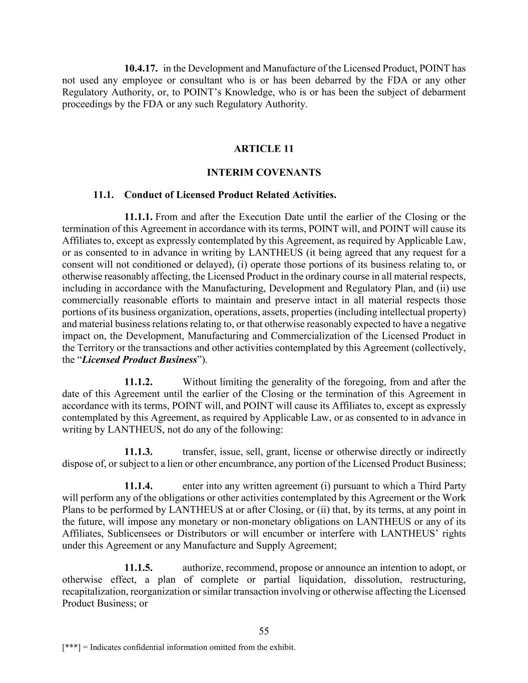 55 [***] = Indicates confidential information omitted from the exhibit. 10.4.17. in the Development and Manufacture of the Licensed Product, POINT has not used any employee or consultant who is or has been debarred by the FDA or any other Regulatory Authority, or, to POINT’s Knowledge, who is or has been the subject of debarment proceedings by the FDA or any such Regulatory Authority. ARTICLE 11 INTERIM COVENANTS 11.1. Conduct of Licensed Product Related Activities. 11.1.1. From and after the Execution Date until the earlier of the Closing or the termination of this Agreement in accordance with its terms, POINT will, and POINT will cause its Affiliates to, except as expressly contemplated by this Agreement, as required by Applicable Law, or as consented to in advance in writing by LANTHEUS (it being agreed that any request for a consent will not conditioned or delayed), (i) operate those portions of its business relating to, or otherwise reasonably affecting, the Licensed Product in the ordinary course in all material respects, including in accordance with the Manufacturing, Development and Regulatory Plan, and (ii) use commercially reasonable efforts to maintain and preserve intact in all material respects those portions of its business organization, operations, assets, properties (including intellectual property) and material business relations relating to, or that otherwise reasonably expected to have a negative impact on, the Development, Manufacturing and Commercialization of the Licensed Product in the Territory or the transactions and other activities contemplated by this Agreement (collectively, the “Licensed Product Business”). 11.1.2. Without limiting the generality of the foregoing, from and after the date of this Agreement until the earlier of the Closing or the termination of this Agreement in accordance with its terms, POINT will, and POINT will cause its Affiliates to, except as expressly contemplated by this Agreement, as required by Applicable Law, or as consented to in advance in writing by LANTHEUS, not do any of the following: 11.1.3. transfer, issue, sell, grant, license or otherwise directly or indirectly dispose of, or subject to a lien or other encumbrance, any portion of the Licensed Product Business; 11.1.4. enter into any written agreement (i) pursuant to which a Third Party will perform any of the obligations or other activities contemplated by this Agreement or the Work Plans to be performed by LANTHEUS at or after Closing, or (ii) that, by its terms, at any point in the future, will impose any monetary or non-monetary obligations on LANTHEUS or any of its Affiliates, Sublicensees or Distributors or will encumber or interfere with LANTHEUS’ rights under this Agreement or any Manufacture and Supply Agreement; 11.1.5. authorize, recommend, propose or announce an intention to adopt, or otherwise effect, a plan of complete or partial liquidation, dissolution, restructuring, recapitalization, reorganization or similar transaction involving or otherwise affecting the Licensed Product Business; or