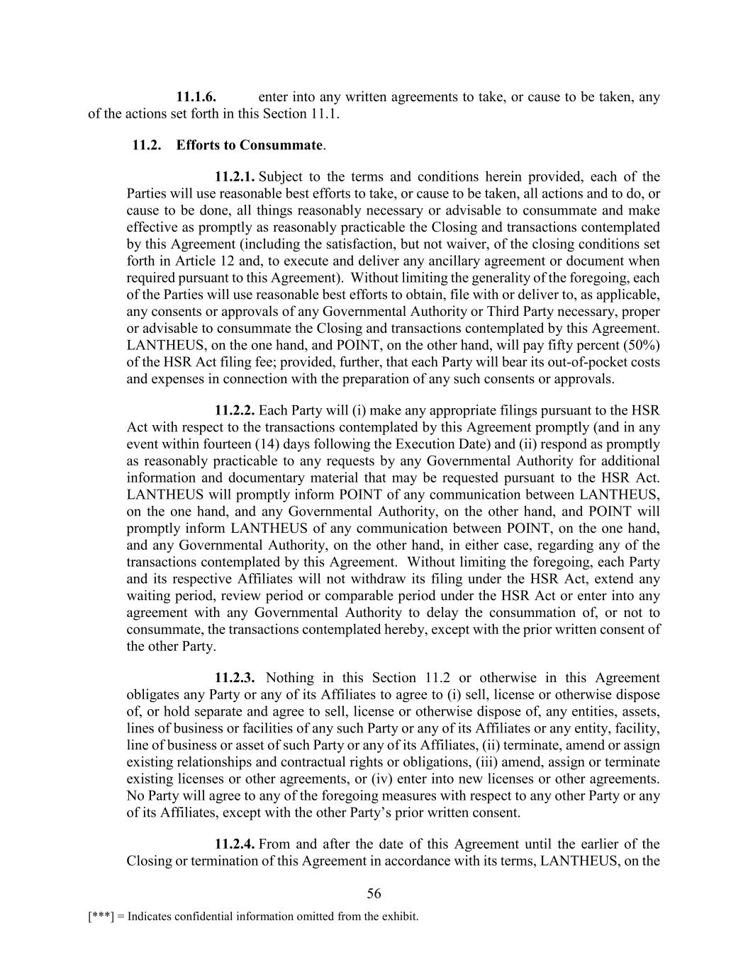 56 [***] = Indicates confidential information omitted from the exhibit. 11.1.6. enter into any written agreements to take, or cause to be taken, any of the actions set forth in this Section 11.1. 11.2. Efforts to Consummate. 11.2.1. Subject to the terms and conditions herein provided, each of the Parties will use reasonable best efforts to take, or cause to be taken, all actions and to do, or cause to be done, all things reasonably necessary or advisable to consummate and make effective as promptly as reasonably practicable the Closing and transactions contemplated by this Agreement (including the satisfaction, but not waiver, of the closing conditions set forth in Article 12 and, to execute and deliver any ancillary agreement or document when required pursuant to this Agreement). Without limiting the generality of the foregoing, each of the Parties will use reasonable best efforts to obtain, file with or deliver to, as applicable, any consents or approvals of any Governmental Authority or Third Party necessary, proper or advisable to consummate the Closing and transactions contemplated by this Agreement. LANTHEUS, on the one hand, and POINT, on the other hand, will pay fifty percent (50%) of the HSR Act filing fee; provided, further, that each Party will bear its out-of-pocket costs and expenses in connection with the preparation of any such consents or approvals. 11.2.2. Each Party will (i) make any appropriate filings pursuant to the HSR Act with respect to the transactions contemplated by this Agreement promptly (and in any event within fourteen (14) days following the Execution Date) and (ii) respond as promptly as reasonably practicable to any requests by any Governmental Authority for additional information and documentary material that may be requested pursuant to the HSR Act. LANTHEUS will promptly inform POINT of any communication between LANTHEUS, on the one hand, and any Governmental Authority, on the other hand, and POINT will promptly inform LANTHEUS of any communication between POINT, on the one hand, and any Governmental Authority, on the other hand, in either case, regarding any of the transactions contemplated by this Agreement. Without limiting the foregoing, each Party and its respective Affiliates will not withdraw its filing under the HSR Act, extend any waiting period, review period or comparable period under the HSR Act or enter into any agreement with any Governmental Authority to delay the consummation of, or not to consummate, the transactions contemplated hereby, except with the prior written consent of the other Party. 11.2.3. Nothing in this Section 11.2 or otherwise in this Agreement obligates any Party or any of its Affiliates to agree to (i) sell, license or otherwise dispose of, or hold separate and agree to sell, license or otherwise dispose of, any entities, assets, lines of business or facilities of any such Party or any of its Affiliates or any entity, facility, line of business or asset of such Party or any of its Affiliates, (ii) terminate, amend or assign existing relationships and contractual rights or obligations, (iii) amend, assign or terminate existing licenses or other agreements, or (iv) enter into new licenses or other agreements. No Party will agree to any of the foregoing measures with respect to any other Party or any of its Affiliates, except with the other Party’s prior written consent. 11.2.4. From and after the date of this Agreement until the earlier of the Closing or termination of this Agreement in accordance with its terms, LANTHEUS, on the