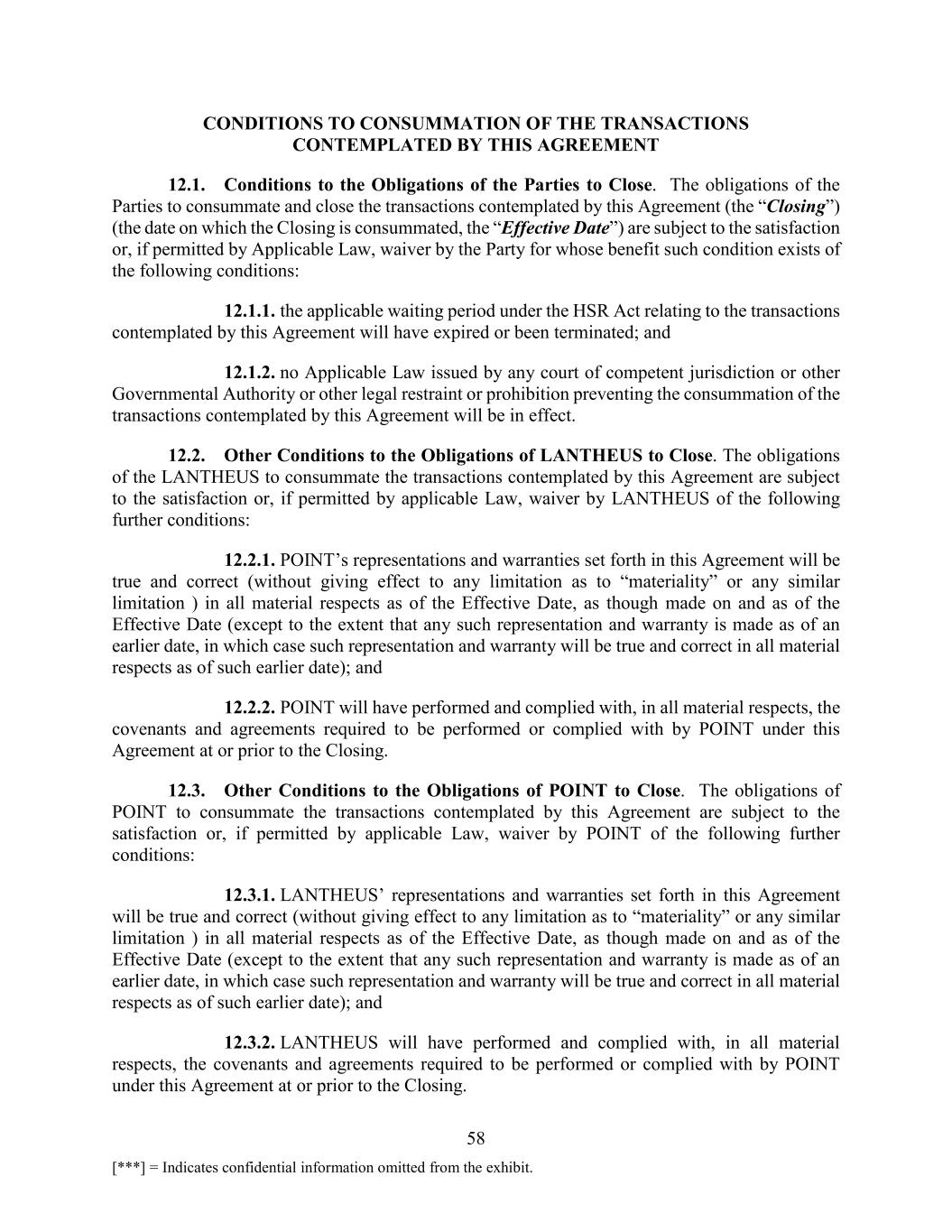58 [***] = Indicates confidential information omitted from the exhibit. CONDITIONS TO CONSUMMATION OF THE TRANSACTIONS CONTEMPLATED BY THIS AGREEMENT 12.1. Conditions to the Obligations of the Parties to Close. The obligations of the Parties to consummate and close the transactions contemplated by this Agreement (the “Closing”) (the date on which the Closing is consummated, the “Effective Date”) are subject to the satisfaction or, if permitted by Applicable Law, waiver by the Party for whose benefit such condition exists of the following conditions: 12.1.1. the applicable waiting period under the HSR Act relating to the transactions contemplated by this Agreement will have expired or been terminated; and 12.1.2. no Applicable Law issued by any court of competent jurisdiction or other Governmental Authority or other legal restraint or prohibition preventing the consummation of the transactions contemplated by this Agreement will be in effect. 12.2. Other Conditions to the Obligations of LANTHEUS to Close. The obligations of the LANTHEUS to consummate the transactions contemplated by this Agreement are subject to the satisfaction or, if permitted by applicable Law, waiver by LANTHEUS of the following further conditions: 12.2.1. POINT’s representations and warranties set forth in this Agreement will be true and correct (without giving effect to any limitation as to “materiality” or any similar limitation ) in all material respects as of the Effective Date, as though made on and as of the Effective Date (except to the extent that any such representation and warranty is made as of an earlier date, in which case such representation and warranty will be true and correct in all material respects as of such earlier date); and 12.2.2. POINT will have performed and complied with, in all material respects, the covenants and agreements required to be performed or complied with by POINT under this Agreement at or prior to the Closing. 12.3. Other Conditions to the Obligations of POINT to Close. The obligations of POINT to consummate the transactions contemplated by this Agreement are subject to the satisfaction or, if permitted by applicable Law, waiver by POINT of the following further conditions: 12.3.1. LANTHEUS’ representations and warranties set forth in this Agreement will be true and correct (without giving effect to any limitation as to “materiality” or any similar limitation ) in all material respects as of the Effective Date, as though made on and as of the Effective Date (except to the extent that any such representation and warranty is made as of an earlier date, in which case such representation and warranty will be true and correct in all material respects as of such earlier date); and 12.3.2. LANTHEUS will have performed and complied with, in all material respects, the covenants and agreements required to be performed or complied with by POINT under this Agreement at or prior to the Closing.