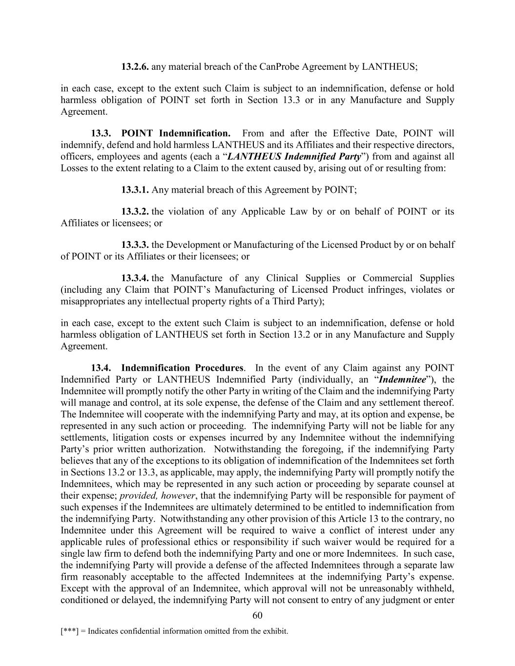 60 [***] = Indicates confidential information omitted from the exhibit. 13.2.6. any material breach of the CanProbe Agreement by LANTHEUS; in each case, except to the extent such Claim is subject to an indemnification, defense or hold harmless obligation of POINT set forth in Section 13.3 or in any Manufacture and Supply Agreement. 13.3. POINT Indemnification. From and after the Effective Date, POINT will indemnify, defend and hold harmless LANTHEUS and its Affiliates and their respective directors, officers, employees and agents (each a “LANTHEUS Indemnified Party”) from and against all Losses to the extent relating to a Claim to the extent caused by, arising out of or resulting from: 13.3.1. Any material breach of this Agreement by POINT; 13.3.2. the violation of any Applicable Law by or on behalf of POINT or its Affiliates or licensees; or 13.3.3. the Development or Manufacturing of the Licensed Product by or on behalf of POINT or its Affiliates or their licensees; or 13.3.4. the Manufacture of any Clinical Supplies or Commercial Supplies (including any Claim that POINT’s Manufacturing of Licensed Product infringes, violates or misappropriates any intellectual property rights of a Third Party); in each case, except to the extent such Claim is subject to an indemnification, defense or hold harmless obligation of LANTHEUS set forth in Section 13.2 or in any Manufacture and Supply Agreement. 13.4. Indemnification Procedures. In the event of any Claim against any POINT Indemnified Party or LANTHEUS Indemnified Party (individually, an “Indemnitee”), the Indemnitee will promptly notify the other Party in writing of the Claim and the indemnifying Party will manage and control, at its sole expense, the defense of the Claim and any settlement thereof. The Indemnitee will cooperate with the indemnifying Party and may, at its option and expense, be represented in any such action or proceeding. The indemnifying Party will not be liable for any settlements, litigation costs or expenses incurred by any Indemnitee without the indemnifying Party’s prior written authorization. Notwithstanding the foregoing, if the indemnifying Party believes that any of the exceptions to its obligation of indemnification of the Indemnitees set forth in Sections 13.2 or 13.3, as applicable, may apply, the indemnifying Party will promptly notify the Indemnitees, which may be represented in any such action or proceeding by separate counsel at their expense; provided, however, that the indemnifying Party will be responsible for payment of such expenses if the Indemnitees are ultimately determined to be entitled to indemnification from the indemnifying Party. Notwithstanding any other provision of this Article 13 to the contrary, no Indemnitee under this Agreement will be required to waive a conflict of interest under any applicable rules of professional ethics or responsibility if such waiver would be required for a single law firm to defend both the indemnifying Party and one or more Indemnitees. In such case, the indemnifying Party will provide a defense of the affected Indemnitees through a separate law firm reasonably acceptable to the affected Indemnitees at the indemnifying Party’s expense. Except with the approval of an Indemnitee, which approval will not be unreasonably withheld, conditioned or delayed, the indemnifying Party will not consent to entry of any judgment or enter