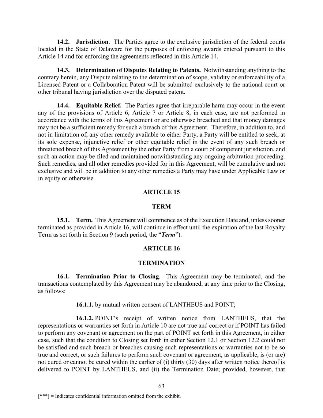63 [***] = Indicates confidential information omitted from the exhibit. 14.2. Jurisdiction. The Parties agree to the exclusive jurisdiction of the federal courts located in the State of Delaware for the purposes of enforcing awards entered pursuant to this Article 14 and for enforcing the agreements reflected in this Article 14. 14.3. Determination of Disputes Relating to Patents. Notwithstanding anything to the contrary herein, any Dispute relating to the determination of scope, validity or enforceability of a Licensed Patent or a Collaboration Patent will be submitted exclusively to the national court or other tribunal having jurisdiction over the disputed patent. 14.4. Equitable Relief. The Parties agree that irreparable harm may occur in the event any of the provisions of Article 6, Article 7 or Article 8, in each case, are not performed in accordance with the terms of this Agreement or are otherwise breached and that money damages may not be a sufficient remedy for such a breach of this Agreement. Therefore, in addition to, and not in limitation of, any other remedy available to either Party, a Party will be entitled to seek, at its sole expense, injunctive relief or other equitable relief in the event of any such breach or threatened breach of this Agreement by the other Party from a court of competent jurisdiction, and such an action may be filed and maintained notwithstanding any ongoing arbitration proceeding. Such remedies, and all other remedies provided for in this Agreement, will be cumulative and not exclusive and will be in addition to any other remedies a Party may have under Applicable Law or in equity or otherwise. ARTICLE 15 TERM 15.1. Term. This Agreement will commence as of the Execution Date and, unless sooner terminated as provided in Article 16, will continue in effect until the expiration of the last Royalty Term as set forth in Section 9 (such period, the “Term”). ARTICLE 16 TERMINATION 16.1. Termination Prior to Closing. This Agreement may be terminated, and the transactions contemplated by this Agreement may be abandoned, at any time prior to the Closing, as follows: 16.1.1. by mutual written consent of LANTHEUS and POINT; 16.1.2. POINT’s receipt of written notice from LANTHEUS, that the representations or warranties set forth in Article 10 are not true and correct or if POINT has failed to perform any covenant or agreement on the part of POINT set forth in this Agreement, in either case, such that the condition to Closing set forth in either Section 12.1 or Section 12.2 could not be satisfied and such breach or breaches causing such representations or warranties not to be so true and correct, or such failures to perform such covenant or agreement, as applicable, is (or are) not cured or cannot be cured within the earlier of (i) thirty (30) days after written notice thereof is delivered to POINT by LANTHEUS, and (ii) the Termination Date; provided, however, that