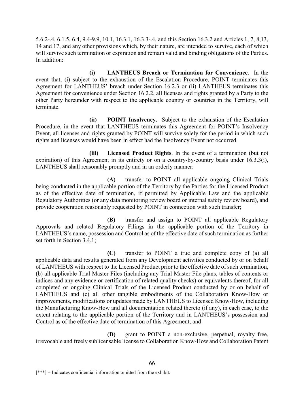 66 [***] = Indicates confidential information omitted from the exhibit. 5.6.2-.4, 6.1.5, 6.4, 9.4-9.9, 10.1, 16.3.1, 16.3.3-.4, and this Section 16.3.2 and Articles 1, 7, 8,13, 14 and 17, and any other provisions which, by their nature, are intended to survive, each of which will survive such termination or expiration and remain valid and binding obligations of the Parties. In addition: (i) LANTHEUS Breach or Termination for Convenience. In the event that, (i) subject to the exhaustion of the Escalation Procedure, POINT terminates this Agreement for LANTHEUS’ breach under Section 16.2.3 or (ii) LANTHEUS terminates this Agreement for convenience under Section 16.2.2, all licenses and rights granted by a Party to the other Party hereunder with respect to the applicable country or countries in the Territory, will terminate. (ii) POINT Insolvency. Subject to the exhaustion of the Escalation Procedure, in the event that LANTHEUS terminates this Agreement for POINT’s Insolvency Event, all licenses and rights granted by POINT will survive solely for the period in which such rights and licenses would have been in effect had the Insolvency Event not occurred. (iii) Licensed Product Rights. In the event of a termination (but not expiration) of this Agreement in its entirety or on a country-by-country basis under 16.3.3(i), LANTHEUS shall reasonably promptly and in an orderly manner: (A) transfer to POINT all applicable ongoing Clinical Trials being conducted in the applicable portion of the Territory by the Parties for the Licensed Product as of the effective date of termination, if permitted by Applicable Law and the applicable Regulatory Authorities (or any data monitoring review board or internal safety review board), and provide cooperation reasonably requested by POINT in connection with such transfer; (B) transfer and assign to POINT all applicable Regulatory Approvals and related Regulatory Filings in the applicable portion of the Territory in LANTHEUS’s name, possession and Control as of the effective date of such termination as further set forth in Section 3.4.1; (C) transfer to POINT a true and complete copy of (a) all applicable data and results generated from any Development activities conducted by or on behalf of LANTHEUS with respect to the Licensed Product prior to the effective date of such termination, (b) all applicable Trial Master Files (including any Trial Master File plans, tables of contents or indices and any evidence or certification of related quality checks) or equivalents thereof, for all completed or ongoing Clinical Trials of the Licensed Product conducted by or on behalf of LANTHEUS and (c) all other tangible embodiments of the Collaboration Know-How or improvements, modifications or updates made by LANTHEUS to Licensed Know-How, including the Manufacturing Know-How and all documentation related thereto (if any), in each case, to the extent relating to the applicable portion of the Territory and in LANTHEUS’s possession and Control as of the effective date of termination of this Agreement; and (D) grant to POINT a non-exclusive, perpetual, royalty free, irrevocable and freely sublicensable license to Collaboration Know-How and Collaboration Patent