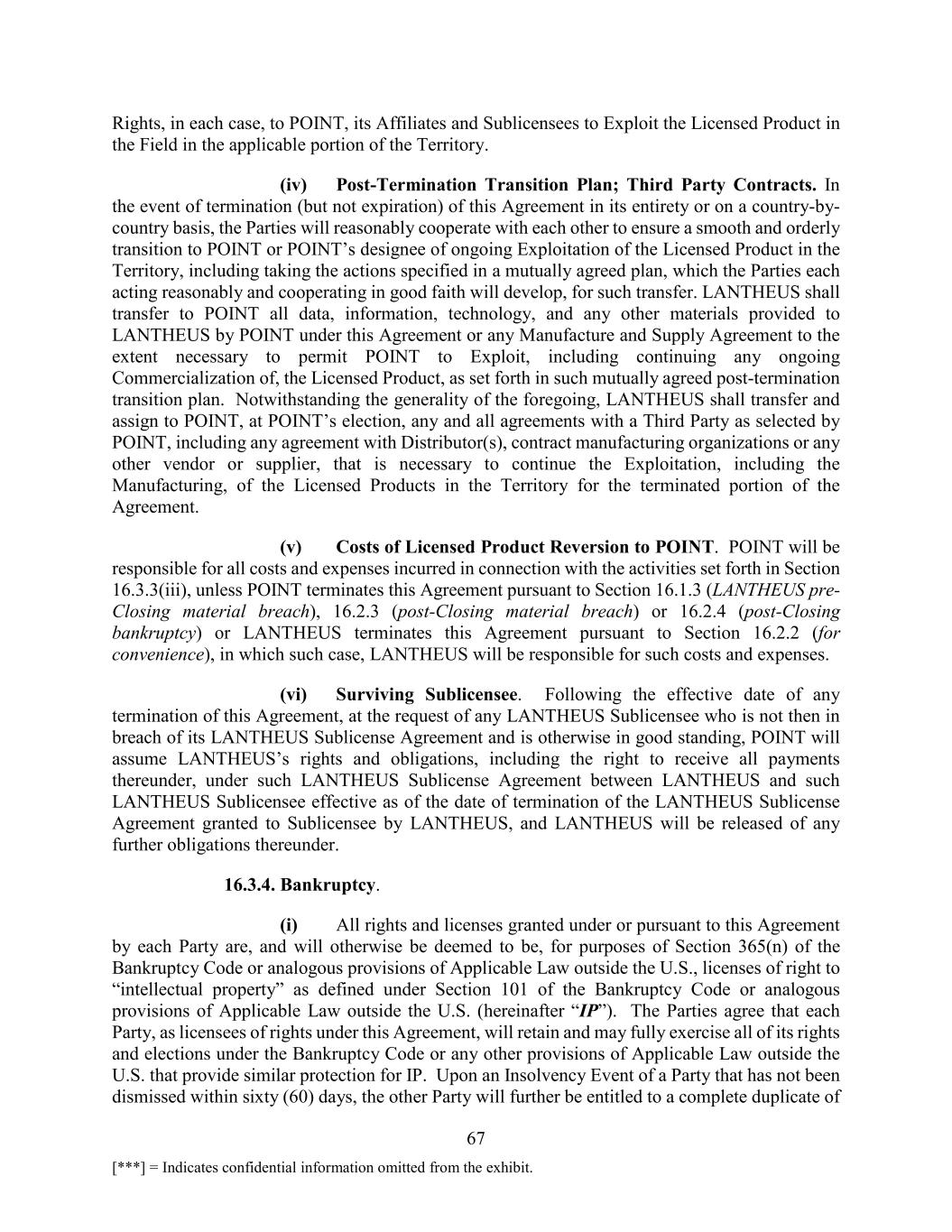 67 [***] = Indicates confidential information omitted from the exhibit. Rights, in each case, to POINT, its Affiliates and Sublicensees to Exploit the Licensed Product in the Field in the applicable portion of the Territory. (iv) Post-Termination Transition Plan; Third Party Contracts. In the event of termination (but not expiration) of this Agreement in its entirety or on a country-by- country basis, the Parties will reasonably cooperate with each other to ensure a smooth and orderly transition to POINT or POINT’s designee of ongoing Exploitation of the Licensed Product in the Territory, including taking the actions specified in a mutually agreed plan, which the Parties each acting reasonably and cooperating in good faith will develop, for such transfer. LANTHEUS shall transfer to POINT all data, information, technology, and any other materials provided to LANTHEUS by POINT under this Agreement or any Manufacture and Supply Agreement to the extent necessary to permit POINT to Exploit, including continuing any ongoing Commercialization of, the Licensed Product, as set forth in such mutually agreed post-termination transition plan. Notwithstanding the generality of the foregoing, LANTHEUS shall transfer and assign to POINT, at POINT’s election, any and all agreements with a Third Party as selected by POINT, including any agreement with Distributor(s), contract manufacturing organizations or any other vendor or supplier, that is necessary to continue the Exploitation, including the Manufacturing, of the Licensed Products in the Territory for the terminated portion of the Agreement. (v) Costs of Licensed Product Reversion to POINT. POINT will be responsible for all costs and expenses incurred in connection with the activities set forth in Section 16.3.3(iii), unless POINT terminates this Agreement pursuant to Section 16.1.3 (LANTHEUS pre- Closing material breach), 16.2.3 (post-Closing material breach) or 16.2.4 (post-Closing bankruptcy) or LANTHEUS terminates this Agreement pursuant to Section 16.2.2 (for convenience), in which such case, LANTHEUS will be responsible for such costs and expenses. (vi) Surviving Sublicensee. Following the effective date of any termination of this Agreement, at the request of any LANTHEUS Sublicensee who is not then in breach of its LANTHEUS Sublicense Agreement and is otherwise in good standing, POINT will assume LANTHEUS’s rights and obligations, including the right to receive all payments thereunder, under such LANTHEUS Sublicense Agreement between LANTHEUS and such LANTHEUS Sublicensee effective as of the date of termination of the LANTHEUS Sublicense Agreement granted to Sublicensee by LANTHEUS, and LANTHEUS will be released of any further obligations thereunder. 16.3.4. Bankruptcy. (i) All rights and licenses granted under or pursuant to this Agreement by each Party are, and will otherwise be deemed to be, for purposes of Section 365(n) of the Bankruptcy Code or analogous provisions of Applicable Law outside the U.S., licenses of right to “intellectual property” as defined under Section 101 of the Bankruptcy Code or analogous provisions of Applicable Law outside the U.S. (hereinafter “IP”). The Parties agree that each Party, as licensees of rights under this Agreement, will retain and may fully exercise all of its rights and elections under the Bankruptcy Code or any other provisions of Applicable Law outside the U.S. that provide similar protection for IP. Upon an Insolvency Event of a Party that has not been dismissed within sixty (60) days, the other Party will further be entitled to a complete duplicate of