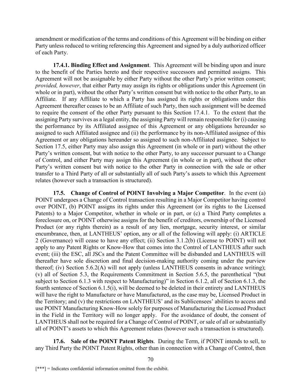 70 [***] = Indicates confidential information omitted from the exhibit. amendment or modification of the terms and conditions of this Agreement will be binding on either Party unless reduced to writing referencing this Agreement and signed by a duly authorized officer of each Party. 17.4.1. Binding Effect and Assignment. This Agreement will be binding upon and inure to the benefit of the Parties hereto and their respective successors and permitted assigns. This Agreement will not be assignable by either Party without the other Party’s prior written consent; provided, however, that either Party may assign its rights or obligations under this Agreement (in whole or in part), without the other Party’s written consent but with notice to the other Party, to an Affiliate. If any Affiliate to which a Party has assigned its rights or obligations under this Agreement thereafter ceases to be an Affiliate of such Party, then such assignment will be deemed to require the consent of the other Party pursuant to this Section 17.4.1. To the extent that the assigning Party survives as a legal entity, the assigning Party will remain responsible for (i) causing the performance by its Affiliated assignee of this Agreement or any obligations hereunder so assigned to such Affiliated assignee and (ii) the performance by its non-Affiliated assignee of this Agreement or any obligations hereunder so assigned to such non-Affiliated assignee. Subject to Section 17.5, either Party may also assign this Agreement (in whole or in part) without the other Party’s written consent, but with notice to the other Party, to any successor pursuant to a Change of Control, and either Party may assign this Agreement (in whole or in part), without the other Party’s written consent but with notice to the other Party in connection with the sale or other transfer to a Third Party of all or substantially all of such Party’s assets to which this Agreement relates (however such a transaction is structured). 17.5. Change of Control of POINT Involving a Major Competitor. In the event (a) POINT undergoes a Change of Control transaction resulting in a Major Competitor having control over POINT, (b) POINT assigns its rights under this Agreement (or its rights to the Licensed Patents) to a Major Competitor, whether in whole or in part, or (c) a Third Party completes a foreclosure on, or POINT otherwise assigns for the benefit of creditors, ownership of the Licensed Product (or any rights therein) as a result of any lien, mortgage, security interest, or similar encumbrance, then, at LANTHEUS’ option, any or all of the following will apply: (i) ARTICLE 2 (Governance) will cease to have any effect; (ii) Section 3.1.2(b) (License to POINT) will not apply to any Patent Rights or Know-How that comes into the Control of LANTHEUS after such event; (iii) the ESC, all JSCs and the Patent Committee will be disbanded and LANTHEUS will thereafter have sole discretion and final decision-making authority coming under the purview thereof; (iv) Section 5.6.2(A) will not apply (unless LANTHEUS consents in advance writing); (v) all of Section 5.3, the Requirements Commitment in Section 5.6.5, the parenthetical “(but subject to Section 6.1.3 with respect to Manufacturing)” in Section 6.1.2, all of Section 6.1.3, the fourth sentence of Section 6.1.5(i), will be deemed to be deleted in their entirety and LANTHEUS will have the right to Manufacture or have Manufactured, as the case may be, Licensed Product in the Territory; and (v) the restrictions on LANTHEUS’ and its Sublicensees’ abilities to access and use POINT Manufacturing Know-How solely for purposes of Manufacturing the Licensed Product in the Field in the Territory will no longer apply. For the avoidance of doubt, the consent of LANTHEUS shall not be required for a Change of Control of POINT, or sale of all or substantially all of POINT’s assets to which this Agreement relates (however such a transaction is structured). 17.6. Sale of the POINT Patent Rights. During the Term, if POINT intends to sell, to any Third Party the POINT Patent Rights, other than in connection with a Change of Control, then