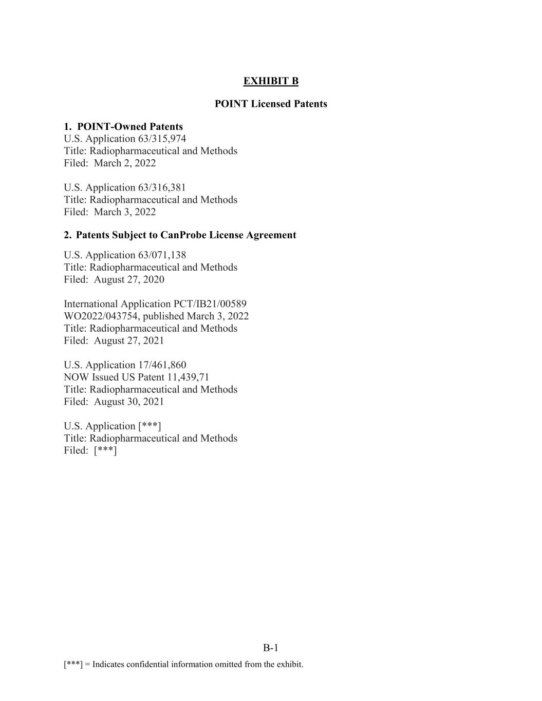 B-1 [***] = Indicates confidential information omitted from the exhibit. EXHIBIT B POINT Licensed Patents 1. POINT-Owned Patents U.S. Application 63/315,974 Title: Radiopharmaceutical and Methods Filed: March 2, 2022 U.S. Application 63/316,381 Title: Radiopharmaceutical and Methods Filed: March 3, 2022 2. Patents Subject to CanProbe License Agreement U.S. Application 63/071,138 Title: Radiopharmaceutical and Methods Filed: August 27, 2020 International Application PCT/IB21/00589 WO2022/043754, published March 3, 2022 Title: Radiopharmaceutical and Methods Filed: August 27, 2021 U.S. Application 17/461,860 NOW Issued US Patent 11,439,71 Title: Radiopharmaceutical and Methods Filed: August 30, 2021 U.S. Application [***] Title: Radiopharmaceutical and Methods Filed: [***]