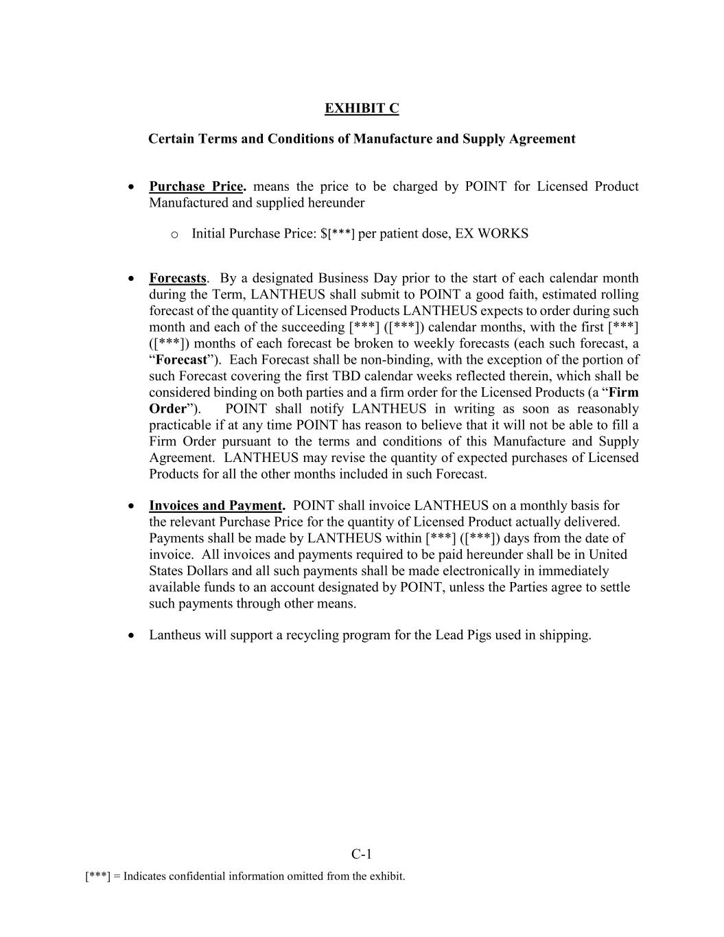 C-1 [***] = Indicates confidential information omitted from the exhibit. EXHIBIT C Certain Terms and Conditions of Manufacture and Supply Agreement Purchase Price. means the price to be charged by POINT for Licensed Product Manufactured and supplied hereunder o Initial Purchase Price: $[***] per patient dose, EX WORKS Forecasts. By a designated Business Day prior to the start of each calendar month during the Term, LANTHEUS shall submit to POINT a good faith, estimated rolling forecast of the quantity of Licensed Products LANTHEUS expects to order during such month and each of the succeeding [***] ([***]) calendar months, with the first [***] ([***]) months of each forecast be broken to weekly forecasts (each such forecast, a “Forecast”). Each Forecast shall be non-binding, with the exception of the portion of such Forecast covering the first TBD calendar weeks reflected therein, which shall be considered binding on both parties and a firm order for the Licensed Products (a “Firm Order”). POINT shall notify LANTHEUS in writing as soon as reasonably practicable if at any time POINT has reason to believe that it will not be able to fill a Firm Order pursuant to the terms and conditions of this Manufacture and Supply Agreement. LANTHEUS may revise the quantity of expected purchases of Licensed Products for all the other months included in such Forecast. Invoices and Payment. POINT shall invoice LANTHEUS on a monthly basis for the relevant Purchase Price for the quantity of Licensed Product actually delivered. Payments shall be made by LANTHEUS within [***] ([***]) days from the date of invoice. All invoices and payments required to be paid hereunder shall be in United States Dollars and all such payments shall be made electronically in immediately available funds to an account designated by POINT, unless the Parties agree to settle such payments through other means. Lantheus will support a recycling program for the Lead Pigs used in shipping.