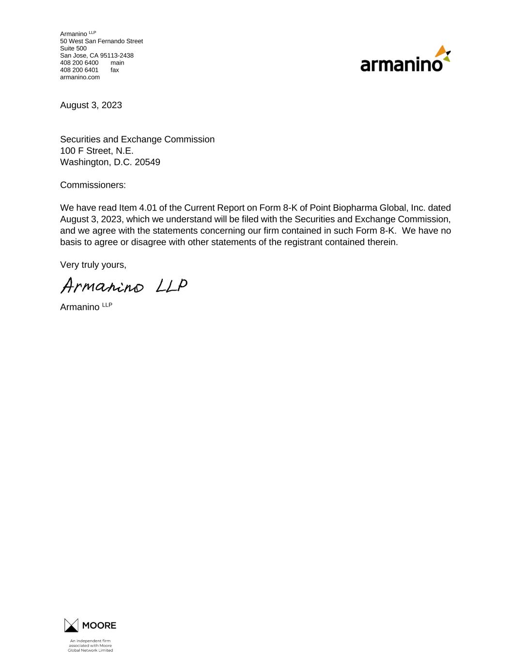 Armanino LLP 50 West San Fernando Street Suite 500 San Jose, CA 95113-2438 408 200 6400 main 408 200 6401 fax armanino.com August 3, 2023 Securities and Exchange Commission 100 F Street, N.E. Washington, D.C. 20549 Commissioners: We have read Item 4.01 of the Current Report on Form 8-K of Point Biopharma Global, Inc. dated August 3, 2023, which we understand will be filed with the Securities and Exchange Commission, and we agree with the statements concerning our firm contained in such Form 8-K. We have no basis to agree or disagree with other statements of the registrant contained therein. Very truly yours, Armanino LLP