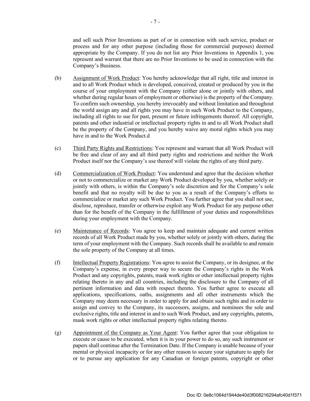 - 7 - and sell such Prior Inventions as part of or in connection with such service, product or process and for any other purpose (including those for commercial purposes) deemed appropriate by the Company. If you do not list any Prior Inventions in Appendix 1, you represent and warrant that there are no Prior Inventions to be used in connection with the Company’s Business. (b) Assignment of Work Product: You hereby acknowledge that all right, title and interest in and to all Work Product which is developed, conceived, created or produced by you in the course of your employment with the Company (either alone or jointly with others, and whether during regular hours of employment or otherwise) is the property of the Company. To confirm such ownership, you hereby irrevocably and without limitation and throughout the world assign any and all rights you may have in such Work Product to the Company, including all rights to sue for past, present or future infringements thereof. All copyright, patents and other industrial or intellectual property rights in and to all Work Product shall be the property of the Company, and you hereby waive any moral rights which you may have in and to the Work Product.d (c) Third Party Rights and Restrictions: You represent and warrant that all Work Product will be free and clear of any and all third party rights and restrictions and neither the Work Product itself nor the Company’s use thereof will violate the rights of any third party. (d) Commercialization of Work Product: You understand and agree that the decision whether or not to commercialize or market any Work Product developed by you, whether solely or jointly with others, is within the Company’s sole discretion and for the Company’s sole benefit and that no royalty will be due to you as a result of the Company’s efforts to commercialize or market any such Work Product. You further agree that you shall not use, disclose, reproduce, transfer or otherwise exploit any Work Product for any purpose other than for the benefit of the Company in the fulfillment of your duties and responsibilities during your employment with the Company. (e) Maintenance of Records: You agree to keep and maintain adequate and current written records of all Work Product made by you, whether solely or jointly with others, during the term of your employment with the Company. Such records shall be available to and remain the sole property of the Company at all times. (f) Intellectual Property Registrations: You agree to assist the Company, or its designee, at the Company’s expense, in every proper way to secure the Company’s rights in the Work Product and any copyrights, patents, mask work rights or other intellectual property rights relating thereto in any and all countries, including the disclosure to the Company of all pertinent information and data with respect thereto. You further agree to execute all applications, specifications, oaths, assignments and all other instruments which the Company may deem necessary in order to apply for and obtain such rights and in order to assign and convey to the Company, its successors, assigns, and nominees the sole and exclusive rights, title and interest in and to such Work Product, and any copyrights, patents, mask work rights or other intellectual property rights relating thereto. (g) Appointment of the Company as Your Agent: You further agree that your obligation to execute or cause to be executed, when it is in your power to do so, any such instrument or papers shall continue after the Termination Date. If the Company is unable because of your mental or physical incapacity or for any other reason to secure your signature to apply for or to pursue any application for any Canadian or foreign patents, copyright or other Doc ID: 0e8c1064d1944de40d3f008216294afc40d1f371