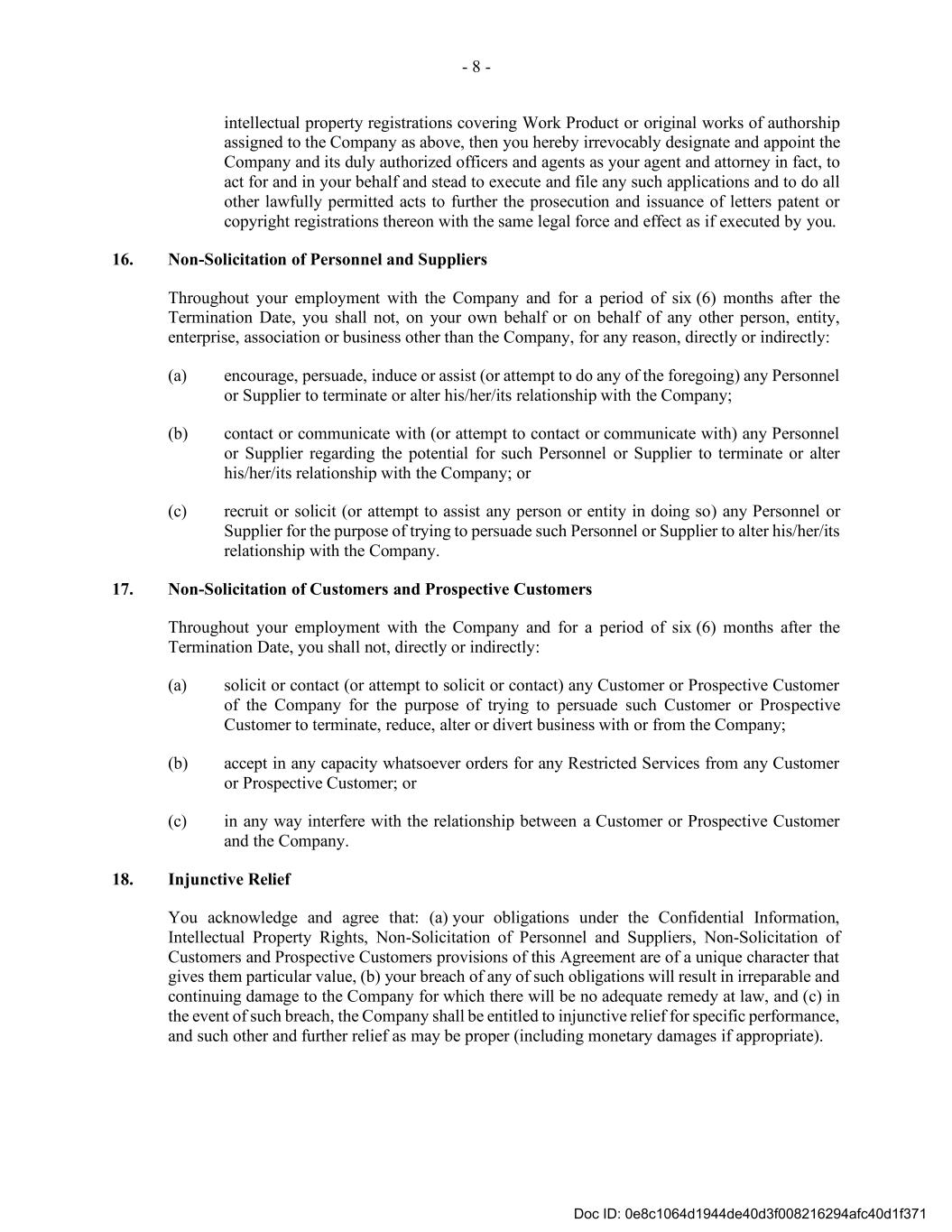 - 8 - intellectual property registrations covering Work Product or original works of authorship assigned to the Company as above, then you hereby irrevocably designate and appoint the Company and its duly authorized officers and agents as your agent and attorney in fact, to act for and in your behalf and stead to execute and file any such applications and to do all other lawfully permitted acts to further the prosecution and issuance of letters patent or copyright registrations thereon with the same legal force and effect as if executed by you. 16. Non-Solicitation of Personnel and Suppliers Throughout your employment with the Company and for a period of six (6) months after the Termination Date, you shall not, on your own behalf or on behalf of any other person, entity, enterprise, association or business other than the Company, for any reason, directly or indirectly: (a) encourage, persuade, induce or assist (or attempt to do any of the foregoing) any Personnel or Supplier to terminate or alter his/her/its relationship with the Company; (b) contact or communicate with (or attempt to contact or communicate with) any Personnel or Supplier regarding the potential for such Personnel or Supplier to terminate or alter his/her/its relationship with the Company; or (c) recruit or solicit (or attempt to assist any person or entity in doing so) any Personnel or Supplier for the purpose of trying to persuade such Personnel or Supplier to alter his/her/its relationship with the Company. 17. Non-Solicitation of Customers and Prospective Customers Throughout your employment with the Company and for a period of six (6) months after the Termination Date, you shall not, directly or indirectly: (a) solicit or contact (or attempt to solicit or contact) any Customer or Prospective Customer of the Company for the purpose of trying to persuade such Customer or Prospective Customer to terminate, reduce, alter or divert business with or from the Company; (b) accept in any capacity whatsoever orders for any Restricted Services from any Customer or Prospective Customer; or (c) in any way interfere with the relationship between a Customer or Prospective Customer and the Company. 18. Injunctive Relief You acknowledge and agree that: (a) your obligations under the Confidential Information, Intellectual Property Rights, Non-Solicitation of Personnel and Suppliers, Non-Solicitation of Customers and Prospective Customers provisions of this Agreement are of a unique character that gives them particular value, (b) your breach of any of such obligations will result in irreparable and continuing damage to the Company for which there will be no adequate remedy at law, and (c) in the event of such breach, the Company shall be entitled to injunctive relief for specific performance, and such other and further relief as may be proper (including monetary damages if appropriate). Doc ID: 0e8c1064d1944de40d3f008216294afc40d1f371
