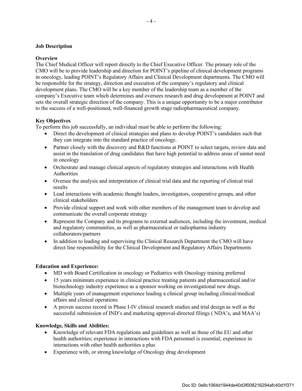 - 4 - Job Description Overview The Chief Medical Officer will report directly to the Chief Executive Officer. The primary role of the CMO will be to provide leadership and direction for POINT’s pipeline of clinical development programs in oncology, leading POINT’s Regulatory Affairs and Clinical Development departments. The CMO will be responsible for the strategy, direction and execution of the company’s regulatory and clinical development plans. The CMO will be a key member of the leadership team as a member of the company’s Executive team which determines and oversees research and drug development at POINT and sets the overall strategic direction of the company. This is a unique opportunity to be a major contributor to the success of a well-positioned, well-financed growth stage radiopharmaceutical company. Key Objectives To perform this job successfully, an individual must be able to perform the following: • Direct the development of clinical strategies and plans to develop POINT’s candidates such that they can integrate into the standard practice of oncology. • Partner closely with the discovery and R&D functions at POINT to select targets, review data and assist in the translation of drug candidates that have high potential to address areas of unmet need in oncology • Orchestrate and manage clinical aspects of regulatory strategies and interactions with Health Authorities • Oversee the analysis and interpretation of clinical trial data and the reporting of clinical trial results • Lead interactions with academic thought leaders, investigators, cooperative groups, and other clinical stakeholders • Provide clinical support and work with other members of the management team to develop and communicate the overall corporate strategy • Represent the Company and its programs to external audiences, including the investment, medical and regulatory communities, as well as pharmaceutical or radiopharma industry collaborators/partners • In addition to leading and supervising the Clinical Research Department the CMO will have direct line responsibility for the Clinical Development and Regulatory Affairs Departments Education and Experience: • MD with Board Certification in oncology or Pediatrics with Oncology training preferred • 15 years minimum experience in clinical practice treating patients and pharmaceutical and/or biotechnology industry experience as a sponsor working on investigational new drugs. • Multiple years of management experience leading a clinical group including clinical/medical affairs and clinical operations • A proven success record in Phase I-IV clinical research studies and trial design as well as the successful submission of IND’s and marketing approval-directed filings ( NDA’s, and MAA’s) Knowledge, Skills and Abilities: • Knowledge of relevant FDA regulations and guidelines as well as those of the EU and other health authorities; experience in interactions with FDA personnel is essential; experience in interactions with other health authorities a plus • Experience with, or strong knowledge of Oncology drug development Doc ID: 0e8c1064d1944de40d3f008216294afc40d1f371