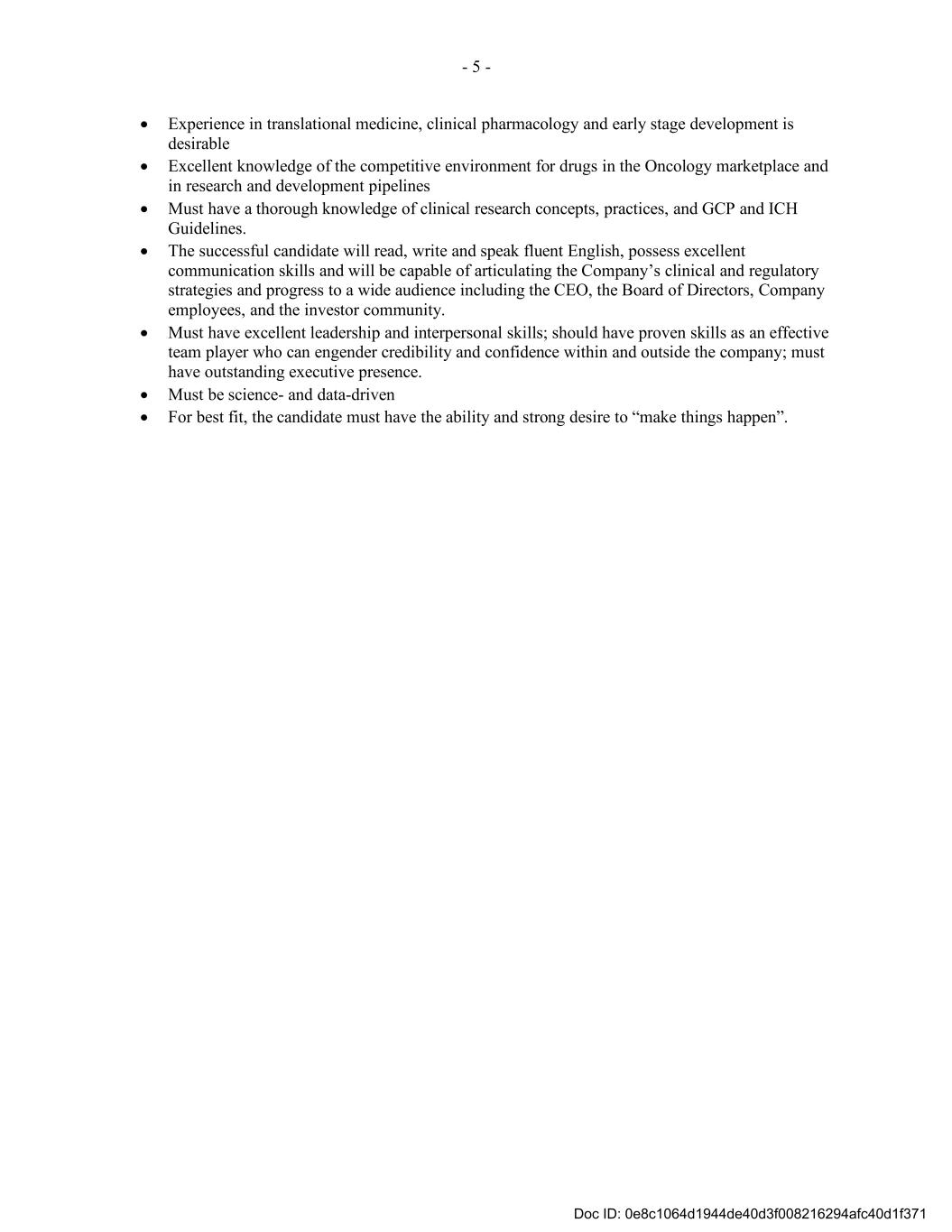 - 5 - • Experience in translational medicine, clinical pharmacology and early stage development is desirable • Excellent knowledge of the competitive environment for drugs in the Oncology marketplace and in research and development pipelines • Must have a thorough knowledge of clinical research concepts, practices, and GCP and ICH Guidelines. • The successful candidate will read, write and speak fluent English, possess excellent communication skills and will be capable of articulating the Company’s clinical and regulatory strategies and progress to a wide audience including the CEO, the Board of Directors, Company employees, and the investor community. • Must have excellent leadership and interpersonal skills; should have proven skills as an effective team player who can engender credibility and confidence within and outside the company; must have outstanding executive presence. • Must be science- and data-driven • For best fit, the candidate must have the ability and strong desire to “make things happen”. Doc ID: 0e8c1064d1944de40d3f008216294afc40d1f371