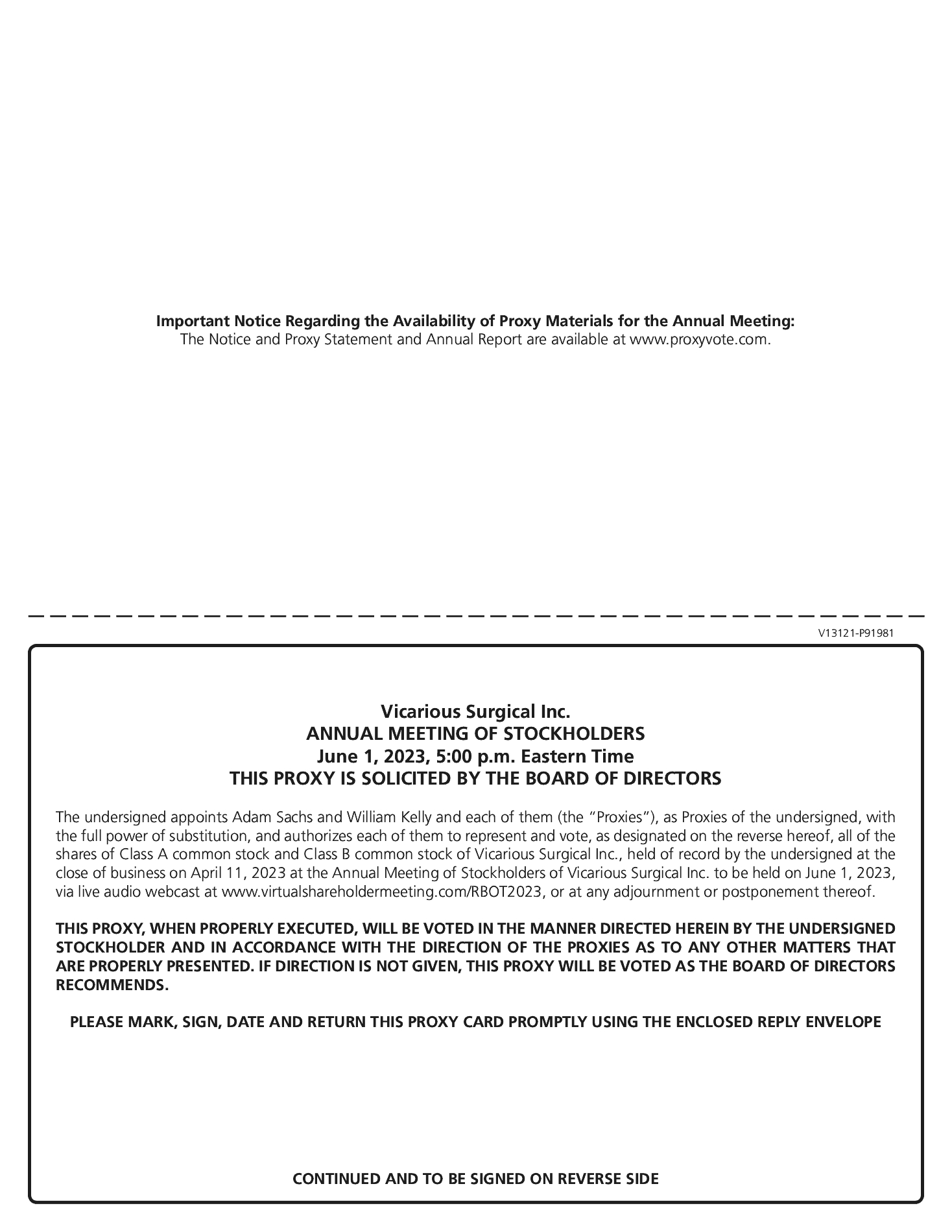 You are cordially invited to attend the 2023 annual meeting of stockholders of Vicarious Surgical Inc. to be held at 5:00 p.m., Eastern Time, on Thursday, June 1, 2023. This year’s annual meeting will be conducted solely via live audio webcast on the Internet. You will be able to attend the annual meeting, vote and submit your questions during the annual meeting by visiting www.virtualshareholdermeeting.com/RBOT2023.