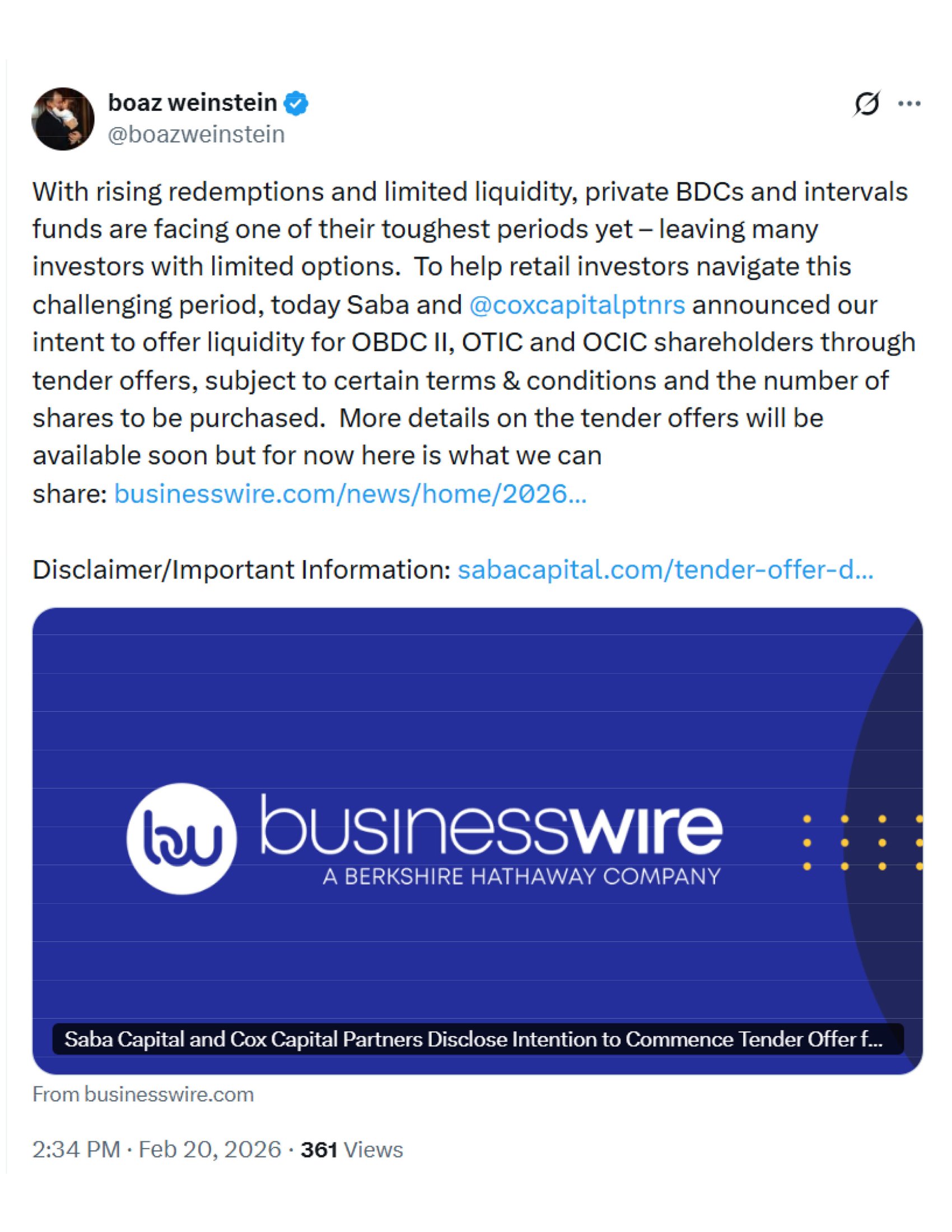 boaz weinstein O Σ c.•'l»c»z \ veirJst«iin With rising redemptions and limited liquidity, private BDCs and intervals funds are facing one of their toughest periods yet — leaving many investors with limited options. To help retail investors navigate this challenging period, today Saba and 9 coxca;oitalt3tioi s announced our intent to offer liquidity for OBDC II, OTIC and OCIC shareholders through tender offers, subject to certain terms & conditions and the number of shares to be purchased. More details on the tender offers will be available soon but for now here is what we can share: l›cisiioess .’lii e.cor7/ne."•›s/lioiote/2025,., Disclaimer/Important Information: s.al‹.acajoital.co æ/tenner — offe — cl... Fi o 'at L‹s ' we, \ I!/' I e ‹ ƒ Oll ƒ 2:34 PM ' Fet3 20, 202t ƒ 361 Vie ’is