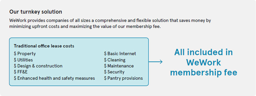WeWork provides a complete solution, flexibility of space and time, and an environment that fosters collaboration. We don’t own the assets, hence are not bootstrapped by mortgages on any assets. Our proposition is turnkey, hence not subject to tenant allowances which add a burden at a time of limited liquidity.