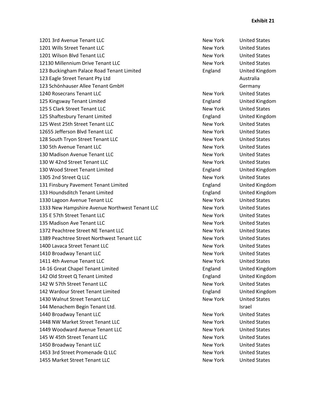 1201 3rd Avenue Tenant LLC New York United States 1201 Wills Street Tenant LLC New York United States 1201 Wilson Blvd Tenant LLC New York United States 12130 Millennium Drive Tenant LLC New York United States 123 Buckingham Palace Road Tenant Limited England United Kingdom 123 Eagle Street Tenant Pty Ltd Australia 123 Schönhauser Allee Tenant GmbH Germany 1240 Rosecrans Tenant LLC New York United States 125 Kingsway Tenant Limited England United Kingdom 125 S Clark Street Tenant LLC New York United States 125 Shaftesbury Tenant Limited England United Kingdom 125 West 25th Street Tenant LLC New York United States 12655 Jefferson Blvd Tenant LLC New York United States 128 South Tryon Street Tenant LLC New York United States 130 5th Avenue Tenant LLC New York United States 130 Madison Avenue Tenant LLC New York United States 130 W 42nd Street Tenant LLC New York United States 130 Wood Street Tenant Limited England United Kingdom 1305 2nd Street Q LLC New York United States 131 Finsbury Pavement Tenant Limited England United Kingdom 133 Houndsditch Tenant Limited England United Kingdom 1330 Lagoon Avenue Tenant LLC New York United States 1333 New Hampshire Avenue Northwest Tenant LLC New York United States 135 E 57th Street Tenant LLC New York United States 135 Madison Ave Tenant LLC New York United States 1372 Peachtree Street NE Tenant LLC New York United States 1389 Peachtree Street Northwest Tenant LLC New York United States 1400 Lavaca Street Tenant LLC New York United States 1410 Broadway Tenant LLC New York United States 1411 4th Avenue Tenant LLC New York United States 14-16 Great Chapel Tenant Limited England United Kingdom 142 Old Street Q Tenant Limited England United Kingdom 142 W 57th Street Tenant LLC New York United States 142 Wardour Street Tenant Limited England United Kingdom 1430 Walnut Street Tenant LLC New York United States 144 Menachem Begin Tenant Ltd. Israel 1440 Broadway Tenant LLC New York United States 1448 NW Market Street Tenant LLC New York United States 1449 Woodward Avenue Tenant LLC New York United States 145 W 45th Street Tenant LLC New York United States 1450 Broadway Tenant LLC New York United States 1453 3rd Street Promenade Q LLC New York United States 1455 Market Street Tenant LLC New York United States Exhibit 21